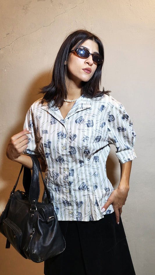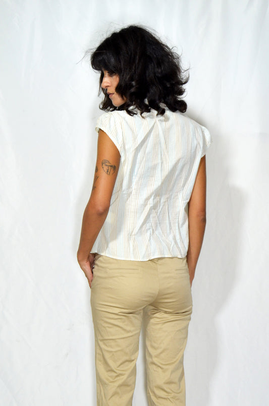 Vintage Striped Cap-Sleeve Button-Up Shirt