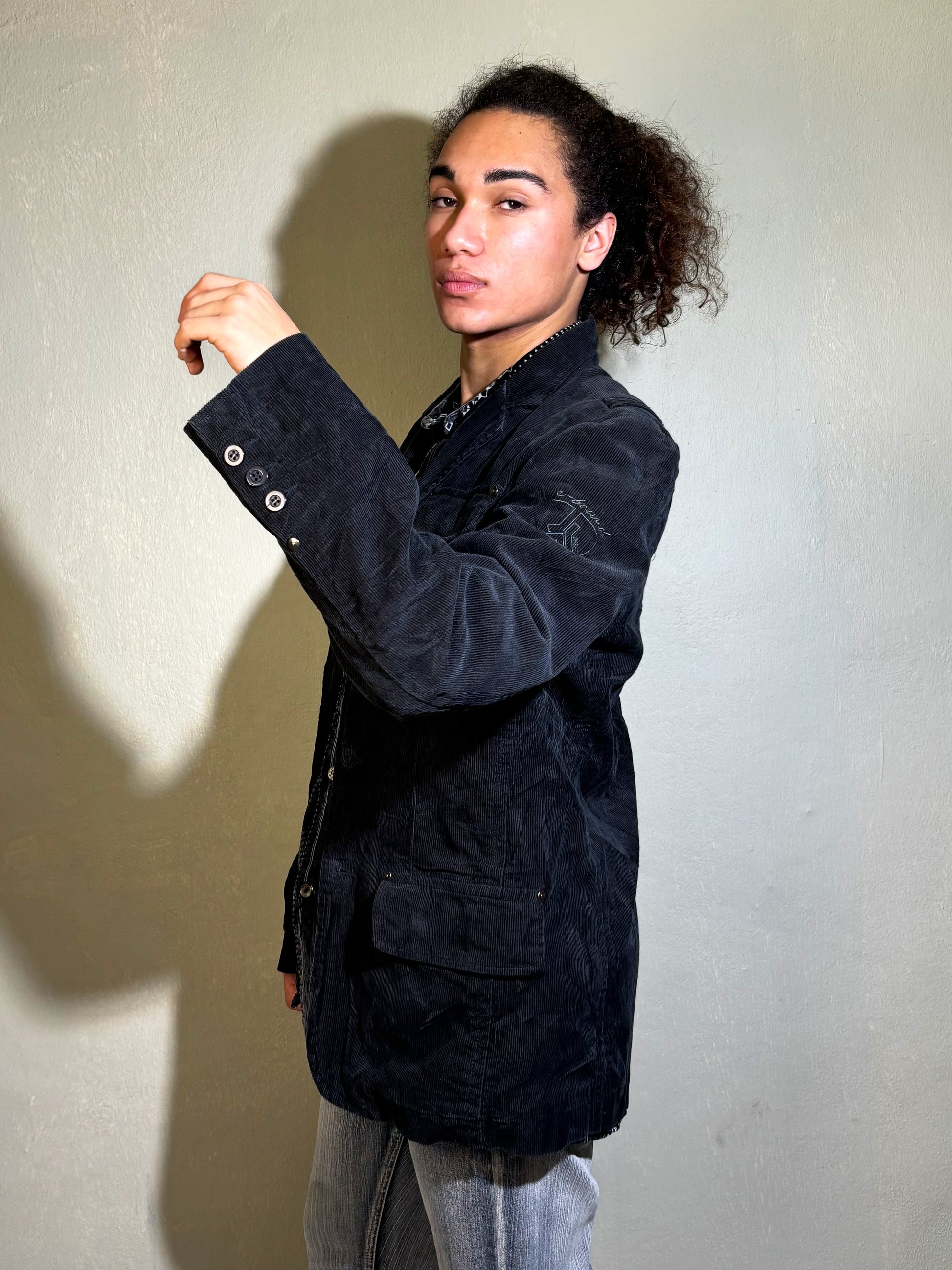 A structured black corduroy jacket with a rugged, utility-inspired design. The thick corduroy texture gives it a soft matte finish, while the tailored cut keeps it sharp and easy to style. Features front flap pockets, subtle seam detailing, and a clean button-up front. Lightweight enough for layering, heavy enough to feel substantial — a perfect everyday vintage jacket.