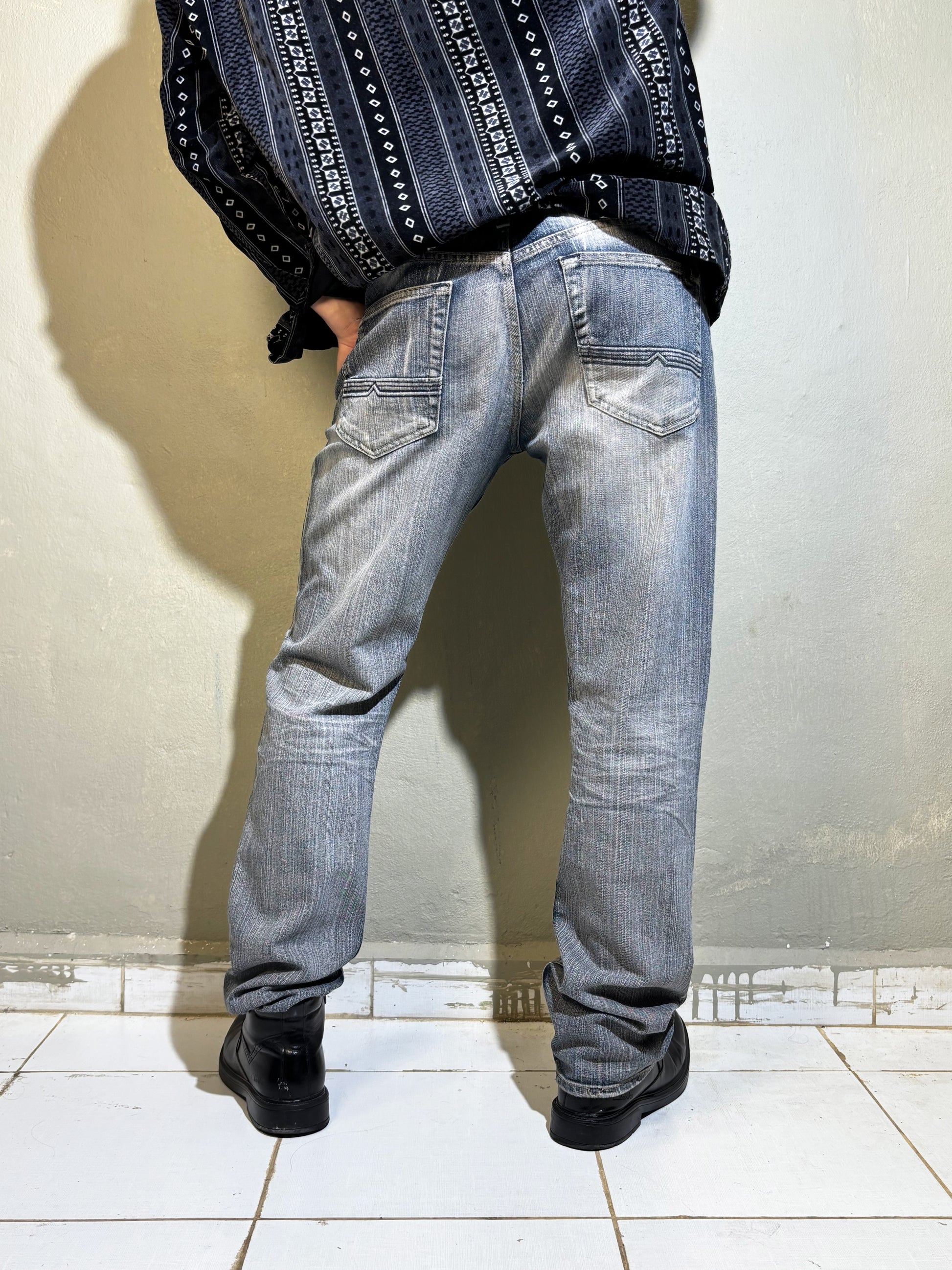 A classic pair of Buffalo David Bitton jeans in a soft light-wash blue, featuring subtle vertical texturing and a naturally worn fade. Designed with a relaxed straight-leg cut, mid rise, and clean minimal detailing — the kind of Y2K denim that looks effortlessly good with anything. The angled back-pocket stitching adds that signature Buffalo touch without overpowering the look.