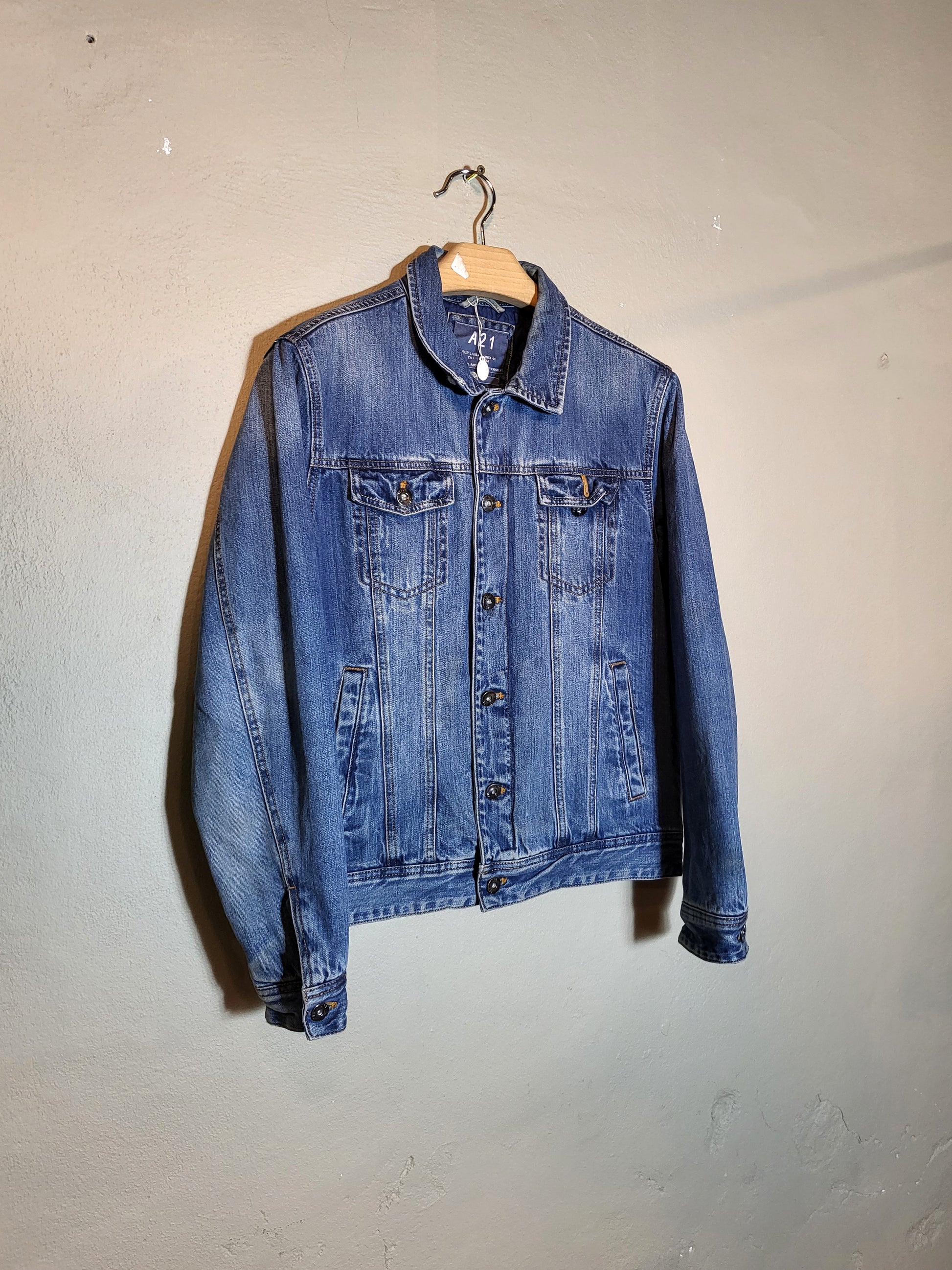 Crafted in a mid-wash blue denim with natural fading throughout, this piece features a structured slim silhouette that defines the shoulders while keeping the overall look sharp and modern. The subtle whiskering and tonal variations give it depth without overpowering the design.