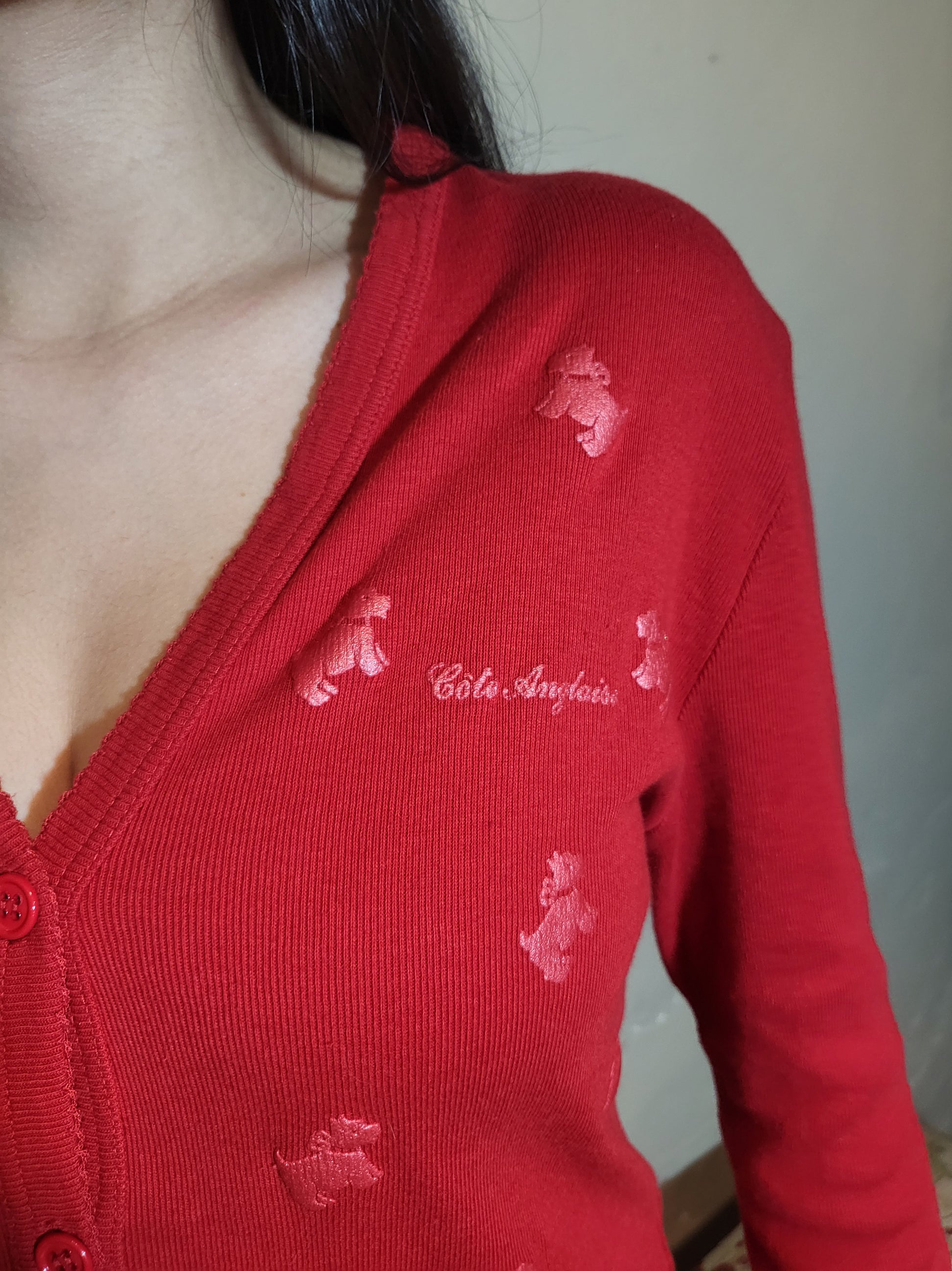 Crafted from a fine red knit with delicate raised motifs woven throughout, this cardigan leans into subtle detail rather than bold contrast. The V-neckline and button-front keep it classic, while the textured pattern adds depth and charm without ever overpowering the silhouette.