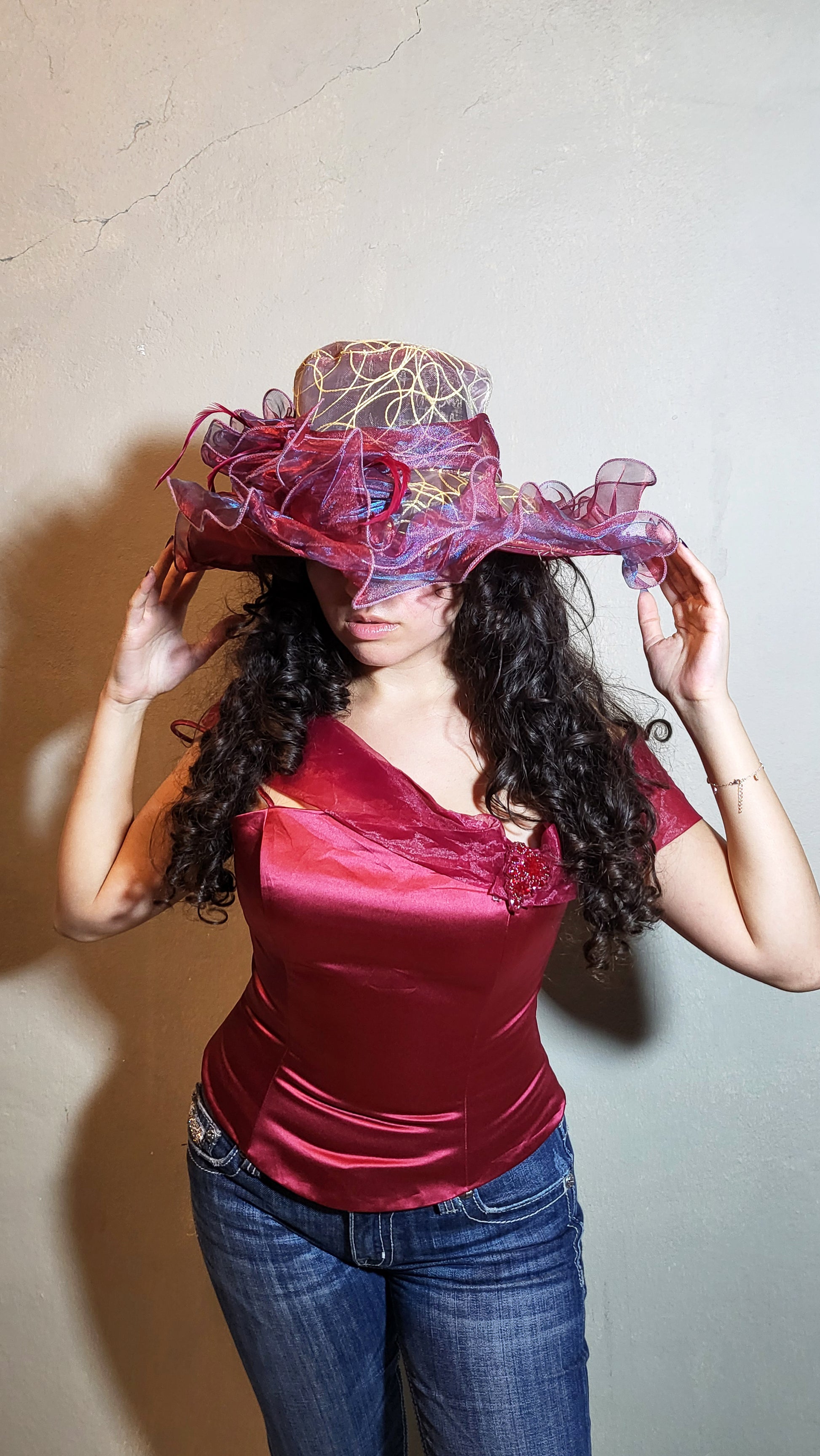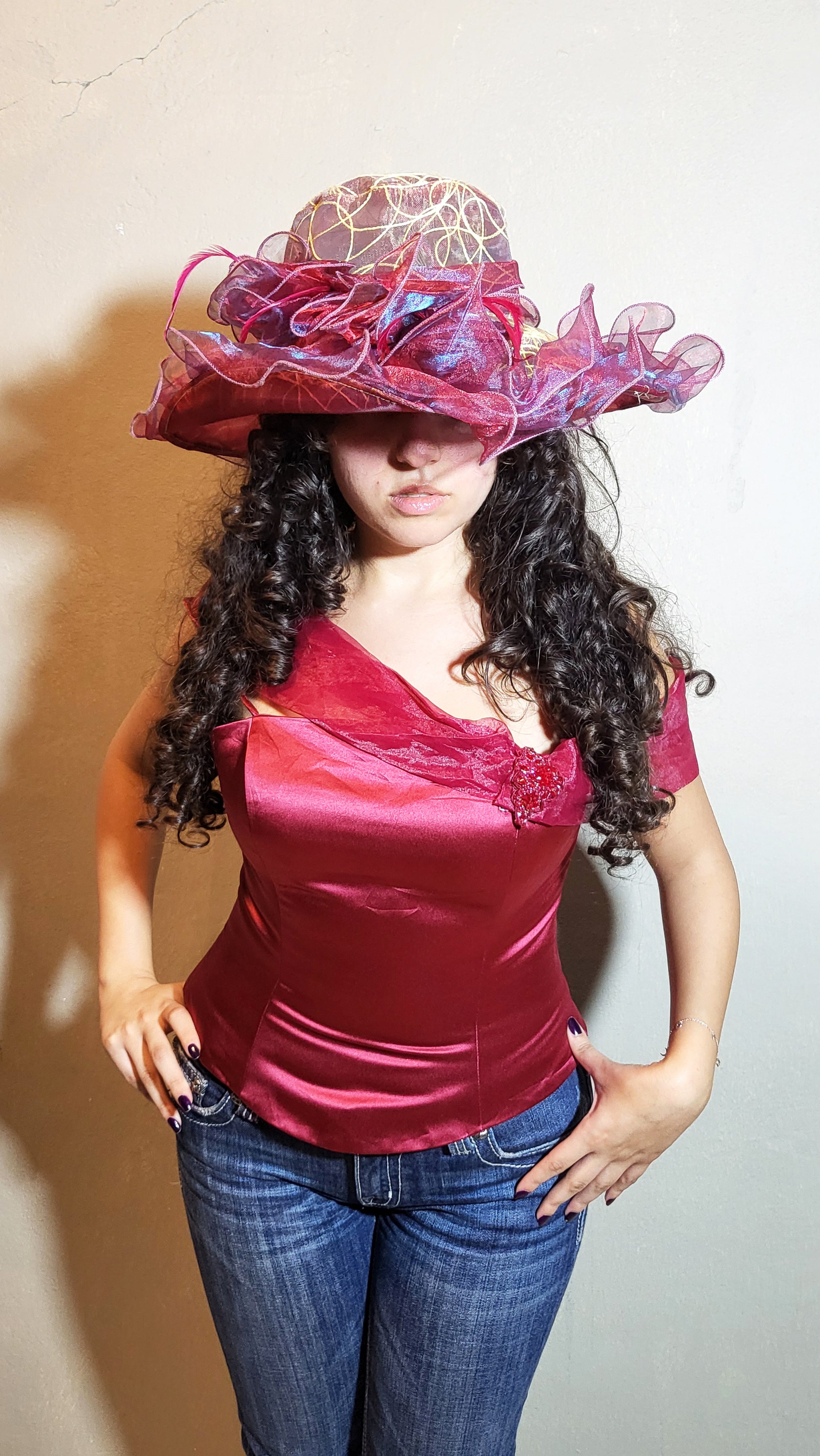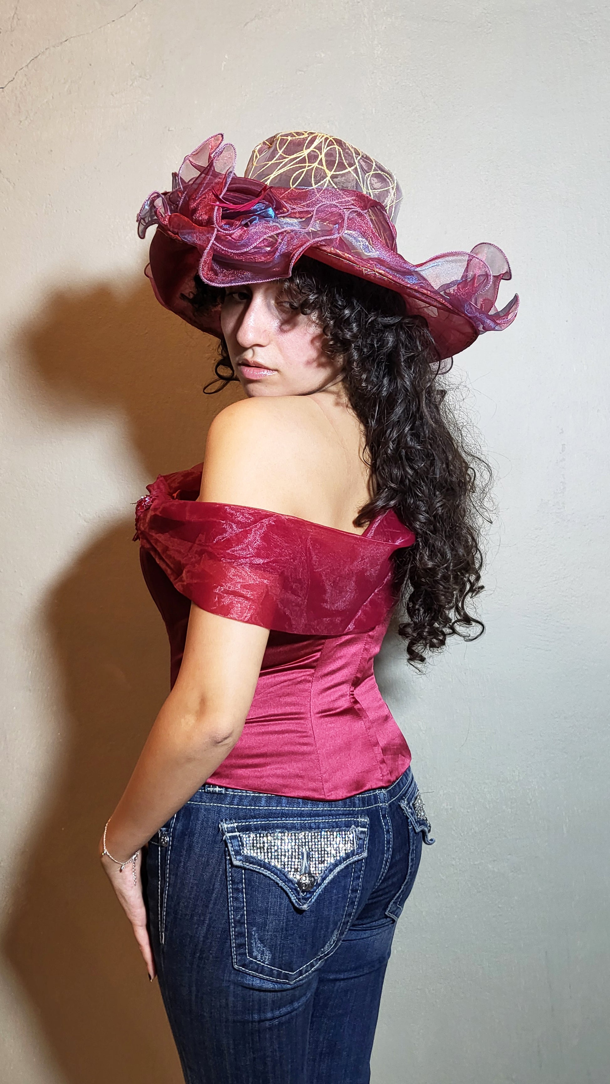 Romantic vintage off-shoulder corset top in a deep crimson satin, designed with a sculpted silhouette that beautifully defines the waist and neckline. Features a sheer organza drape across the shoulders and a delicate beaded floral applique at the bust for a touch of evening glamour. Structured seaming enhances the fit, creating a flattering, hourglass shape.