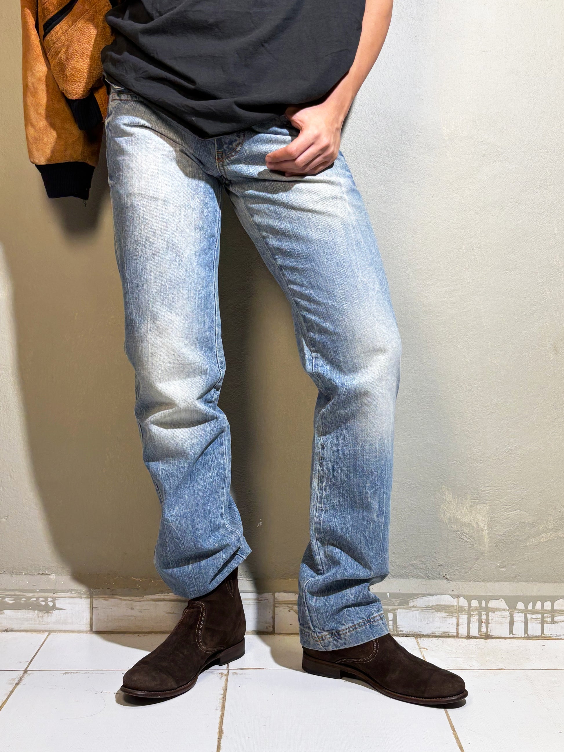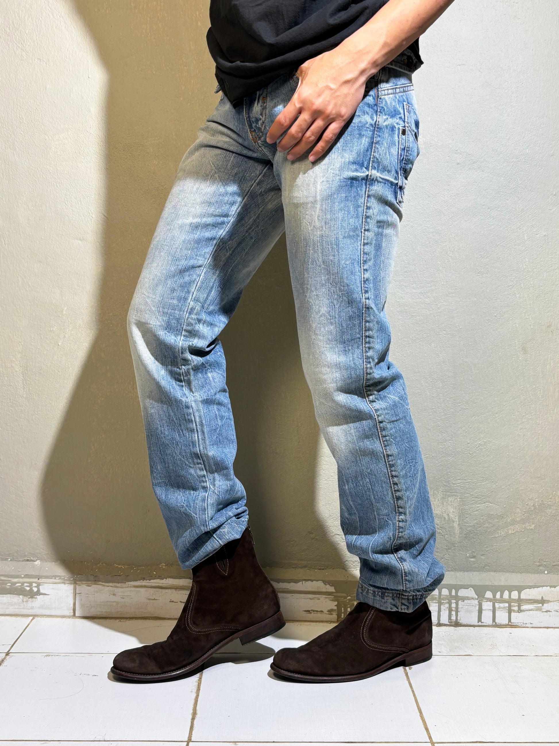 A rare pair of authentic Dolce & Gabbana jeans in a light-wash blue with heavy Y2K distressing and that iconic D&G leather patch at the back. Designed with a straight-leg cut, low rise, and exaggerated whiskering for a true 2000s silhouette. Features oversized back pockets with angular stitching — a signature D&G detail — and a soft, worn-in denim feel.