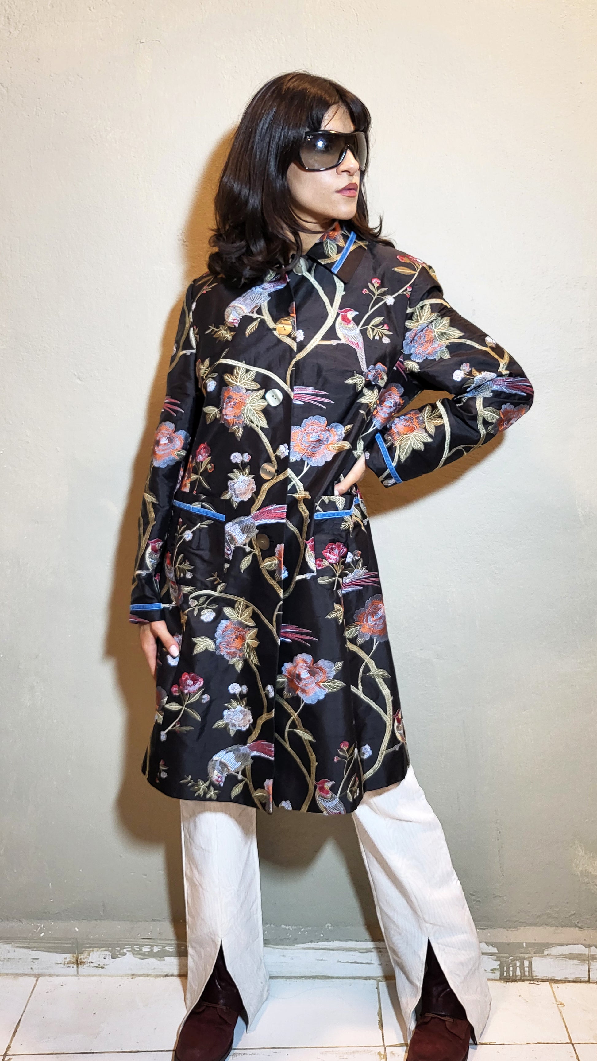 A stunning embroidered satin coat featuring intricate floral and bird motifs in rich, vibrant tones. Tailored in a softly structured silhouette with subtle flare, it blends elegance with a touch of drama. Blue Velvet details on the cuffs and pockets.