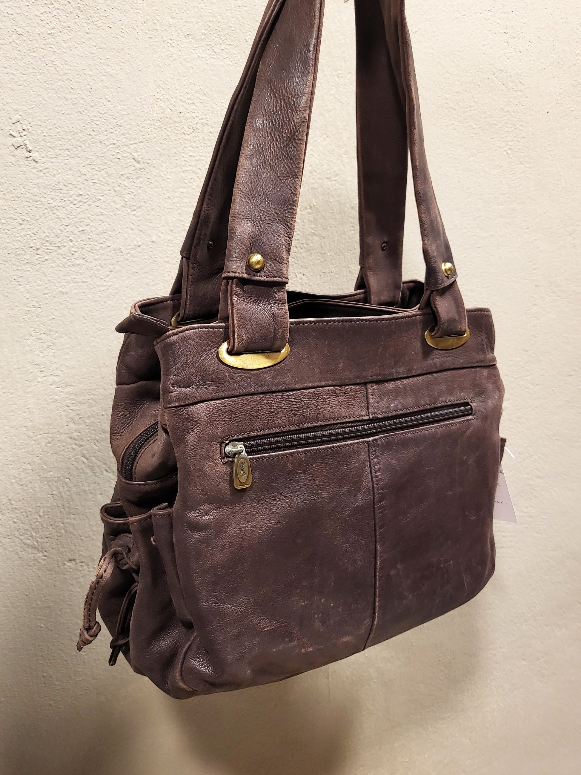• Details: Double shoulder straps, brass-tone hardware, zip closure, exterior zip pocket, multiple inner compartments