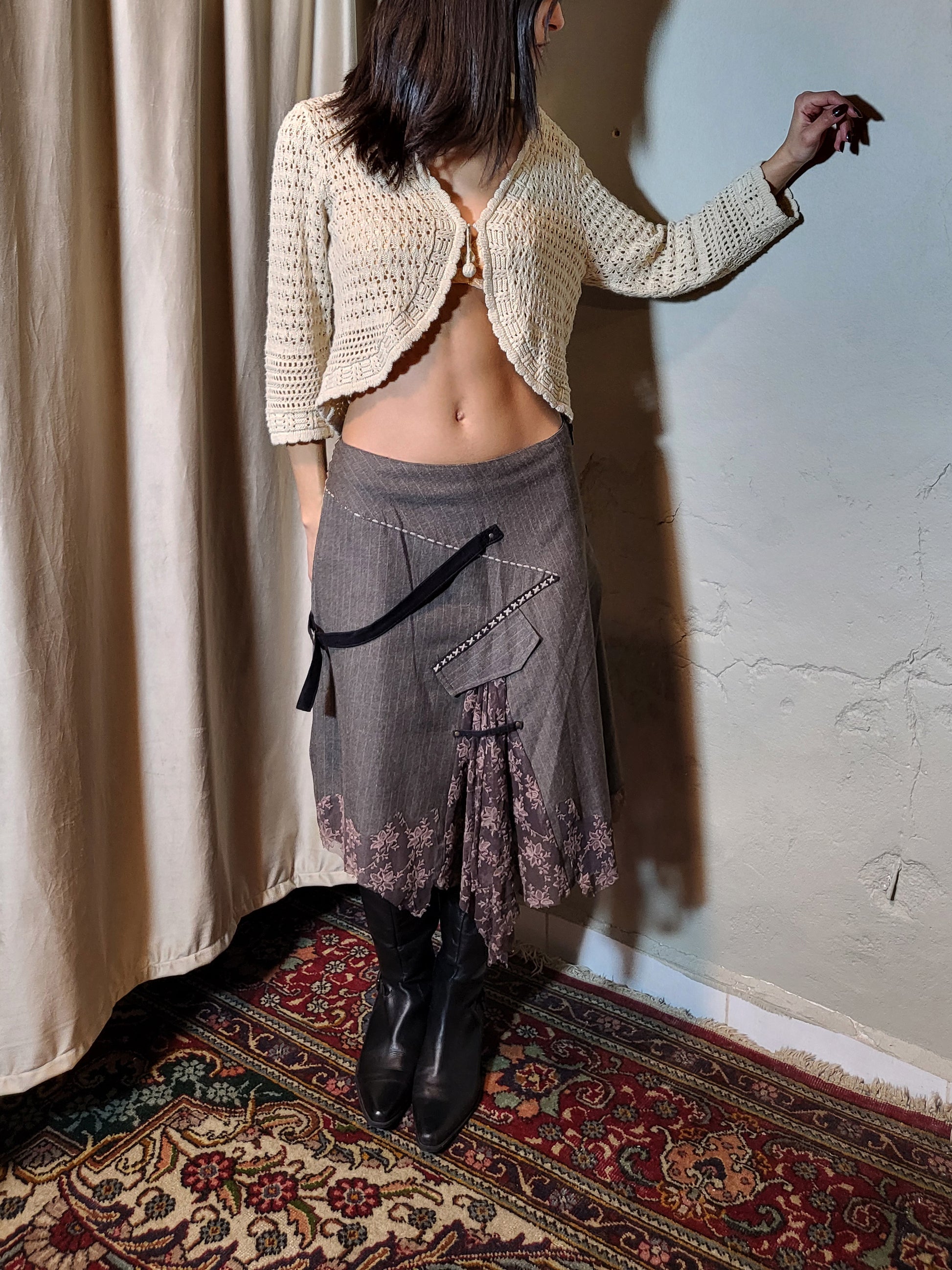 A beautifully unconventional grey pinstripe midi skirt that feels designed, not just made. This piece plays with structure and softness, combining tailored menswear codes with romantic, almost lingerie-like details — a true vintage statement without being loud.