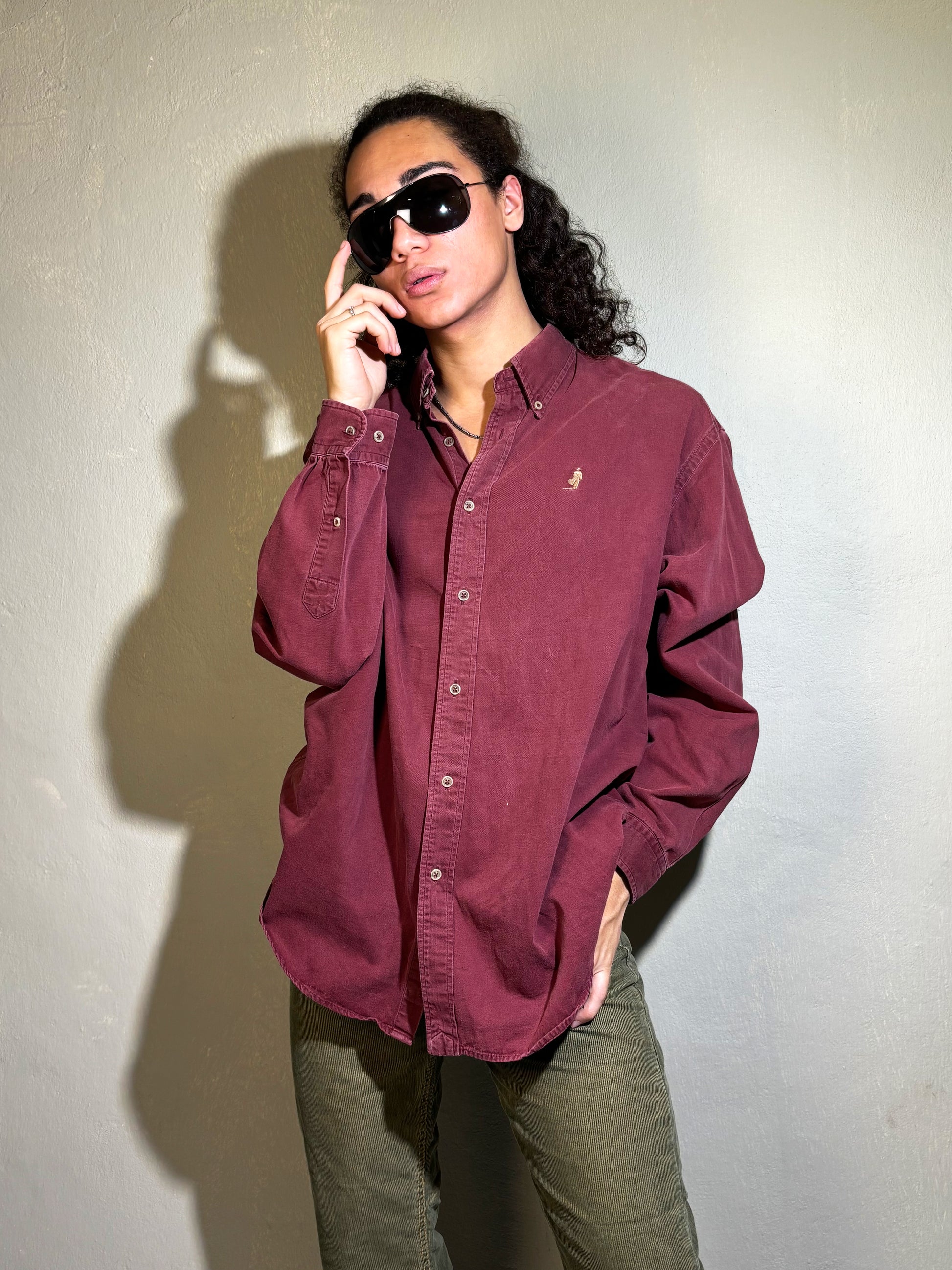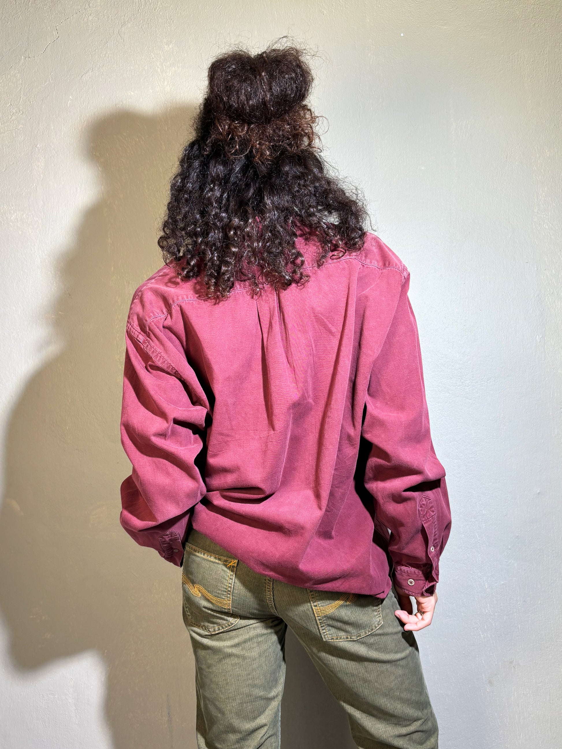 A relaxed, rugged-style Marlboro Classics button-down in a deep washed burgundy. Designed in a soft, slightly faded cotton that gives it that authentic worn-in Western look. Features the signature embroidered logo, a button-down collar, and an easy, oversized silhouette that works perfectly layered or worn on its own. A rare MCS piece with the perfect vintage fade.