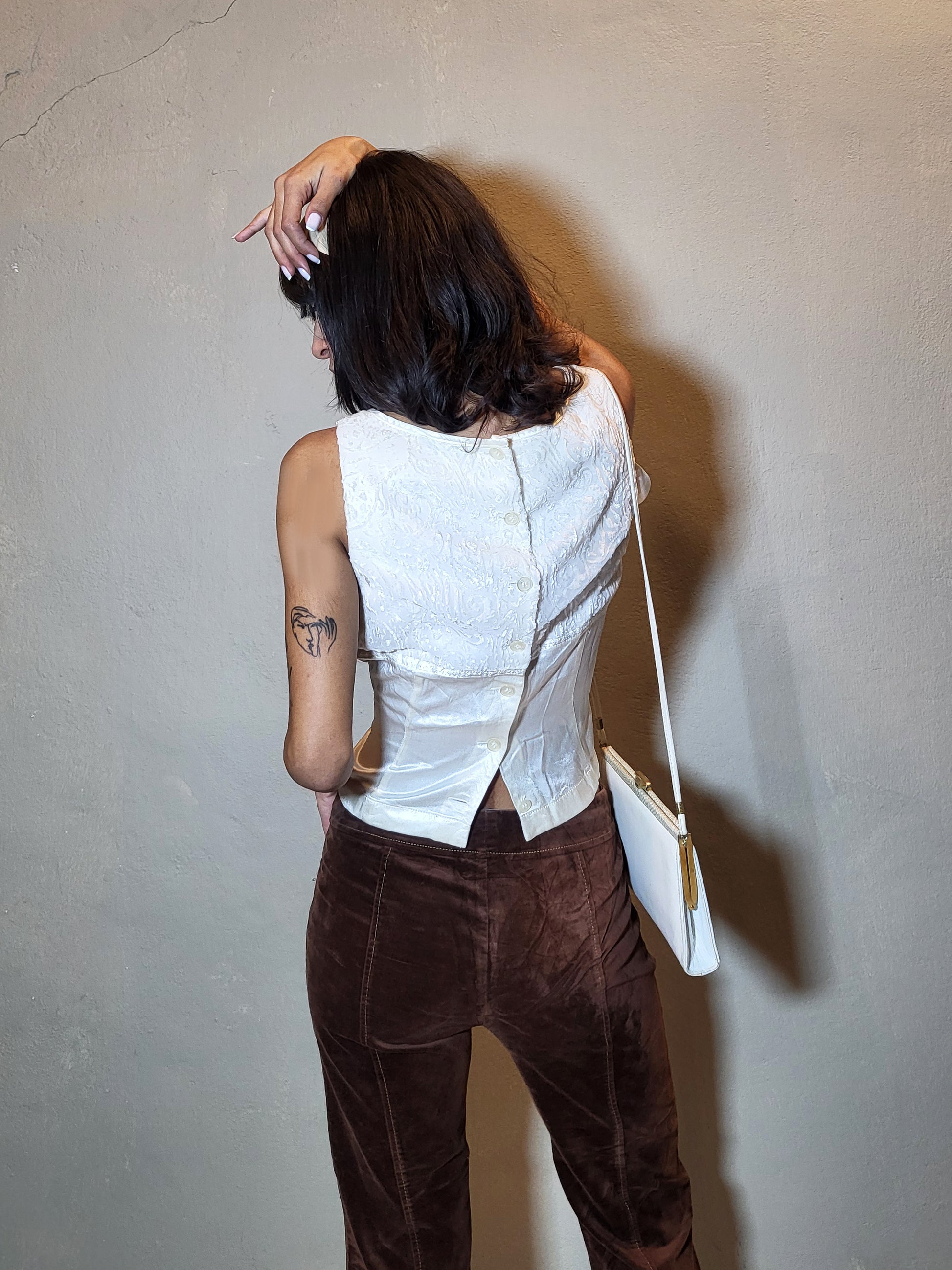 A beautifully structured Marzo top crafted in a soft pearl-white satin jacquard that catches light with every movement. The front features delicate tonal floral embroidery and a subtle corset-inspired silhouette that shapes the waist without feeling rigid.