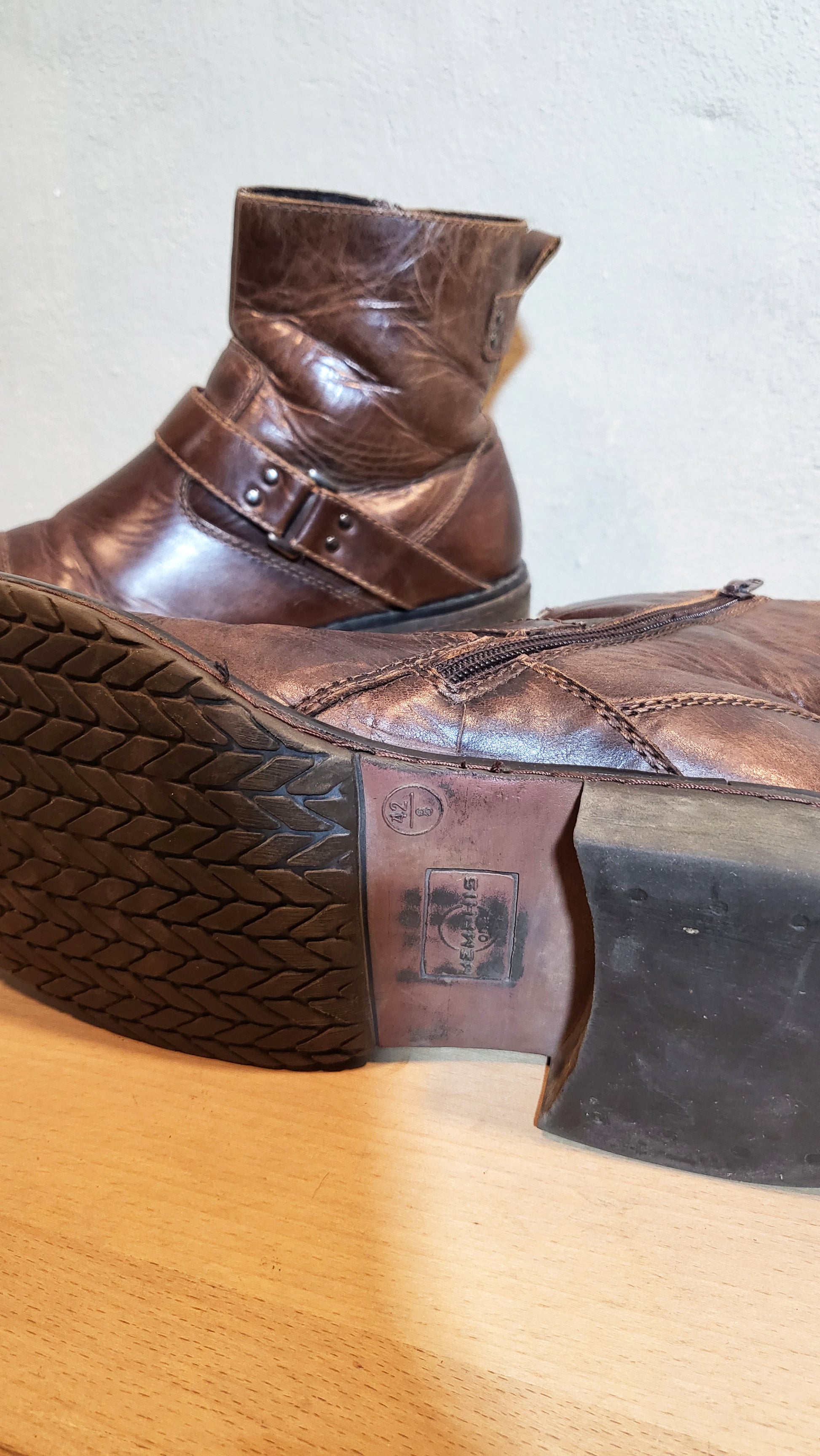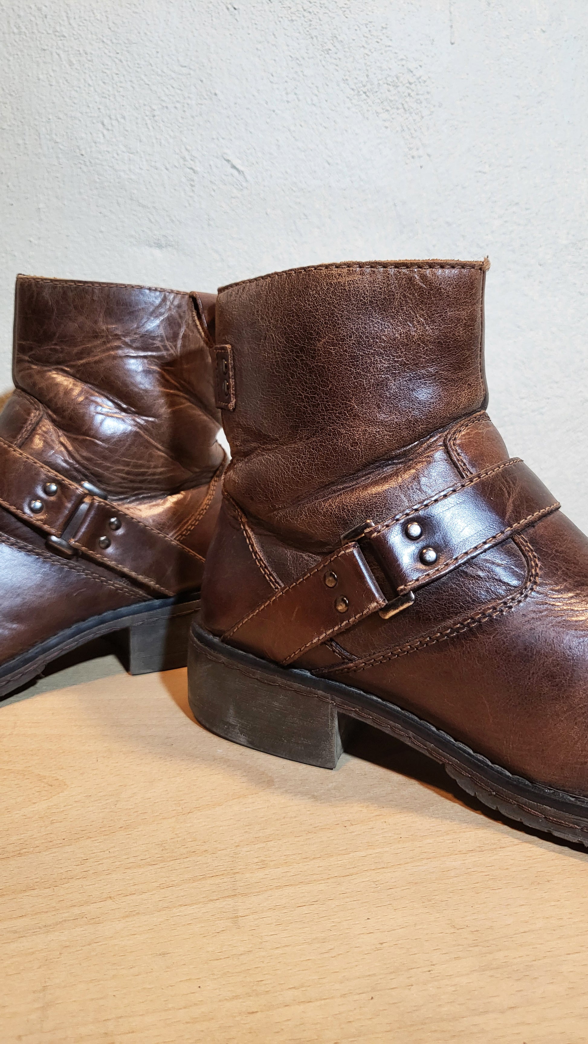 Vintage Memphis ankle boots crafted in rich brown genuine leather with a naturally distressed patina. Designed with a classic biker-inspired silhouette, featuring a side zipper for easy wear, a decorative strap with metal buckle, and sturdy stitched panel detailing. Set on a durable rubber sole for comfort and everyday use.