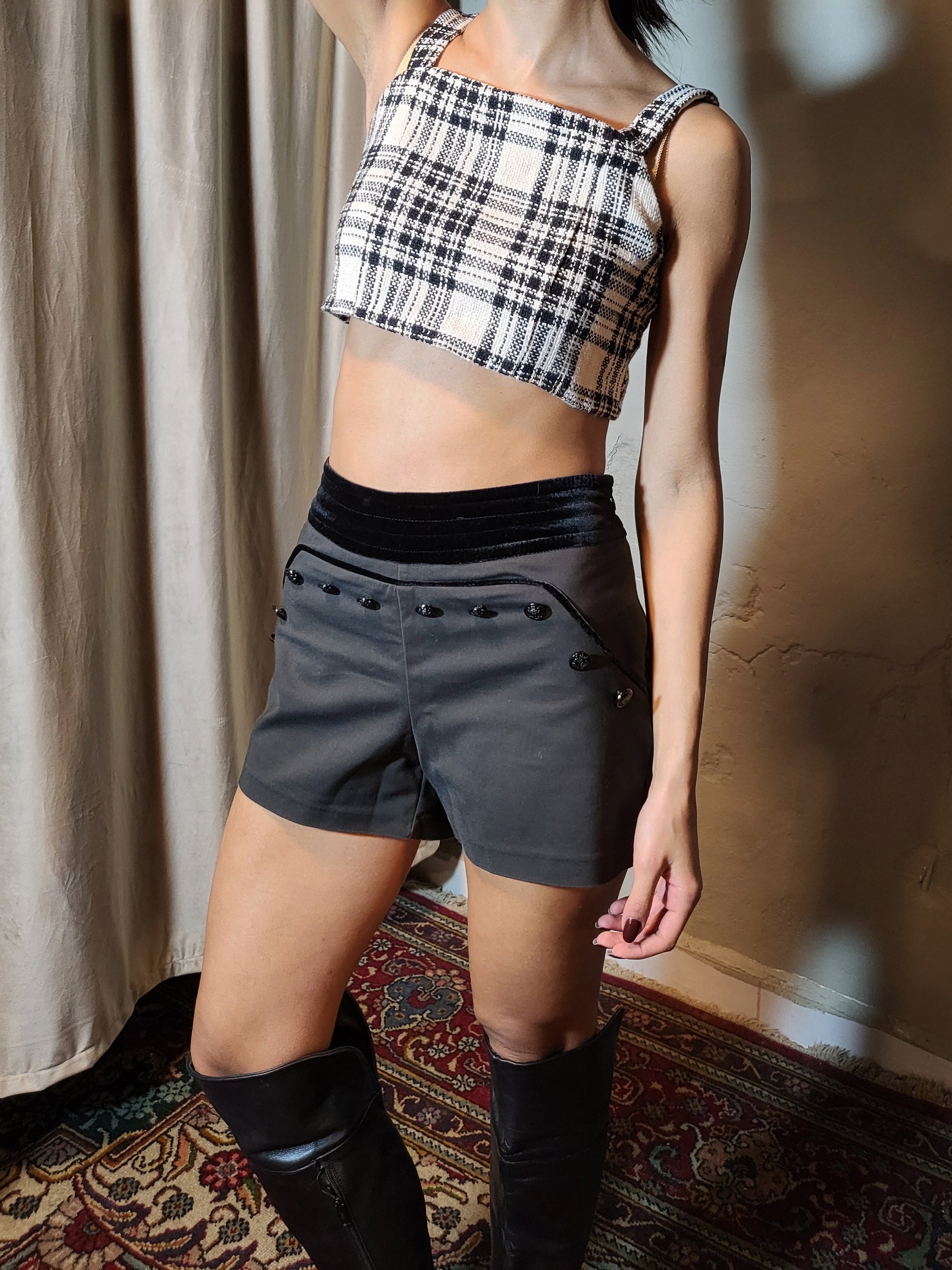 • Material: Structured woven fabric with velvet waistband