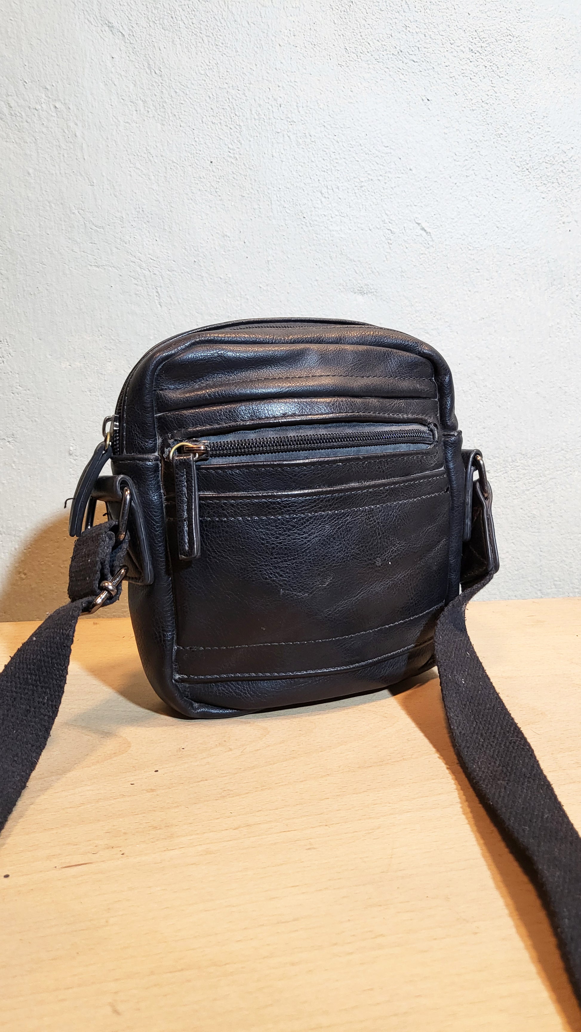 Compact Paco Martínez crossbody bag crafted in smooth genuine leather with a soft, naturally worn finish in classic black. Designed for everyday function, it features a structured rectangular silhouette, adjustable canvas shoulder strap, and multiple front zip pockets for quick access to essentials. The full top-zip closure opens to a practical interior with an additional zip pocket for secure storage.