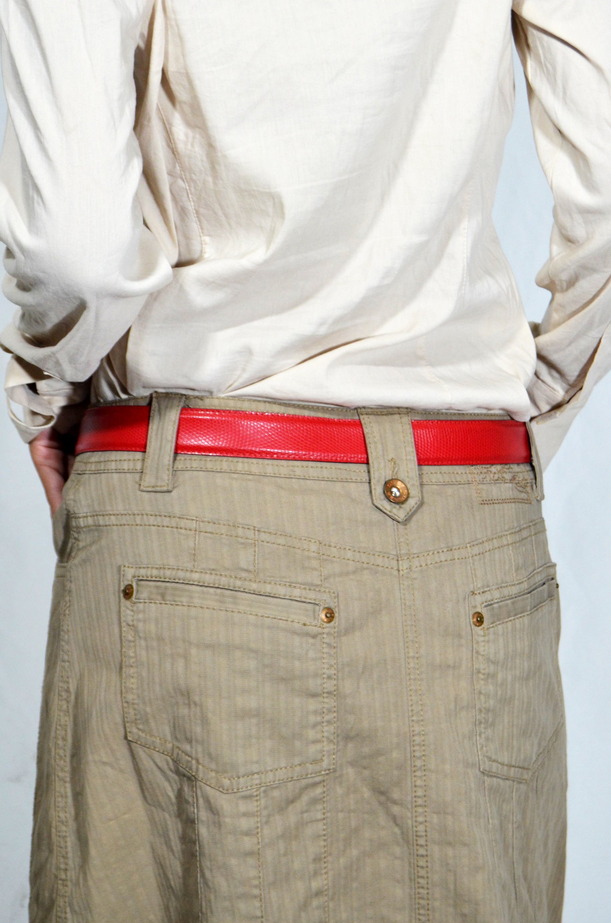 Sleek and bold red leather belt featuring a shiny gold buckle.