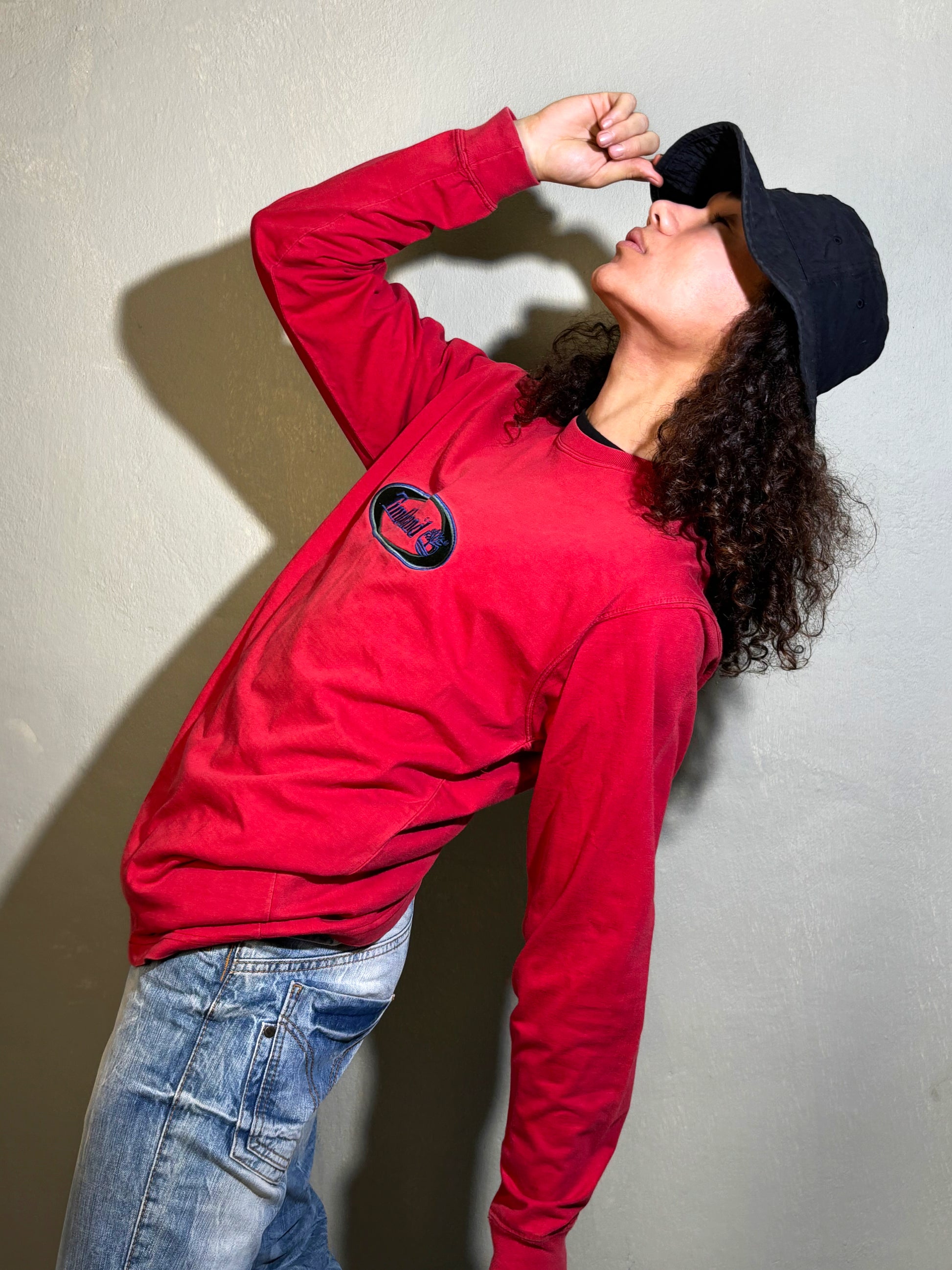A classic Timberland long-sleeve in a vibrant vintage red, featuring the iconic embroidered oval Timberland logo at the chest. Made from soft, mid-weight cotton with a relaxed, easy fit. The slight natural fading gives it that authentic worn-in 90s/early-2000s vibe. Perfect with cargos, denim, or layered under a jacket.