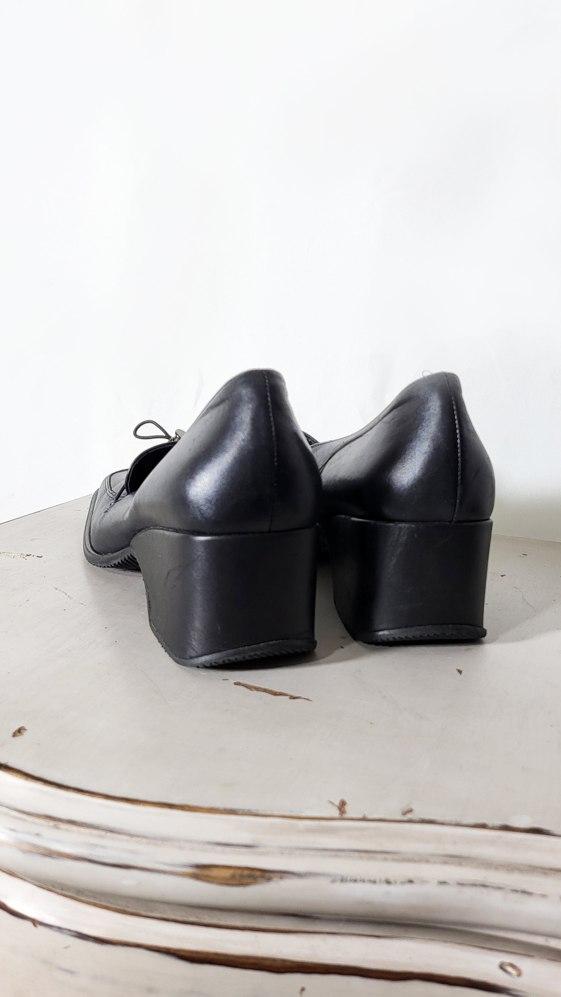 Elegant black leather loafers from the 1990s, featuring a sleek square toe, wedge heel, and subtle lace-through detail with metallic accents. A perfect mix of minimalism and sophistication, these shoes carry the refined edge of late-90s office chic while staying versatile for modern wear.