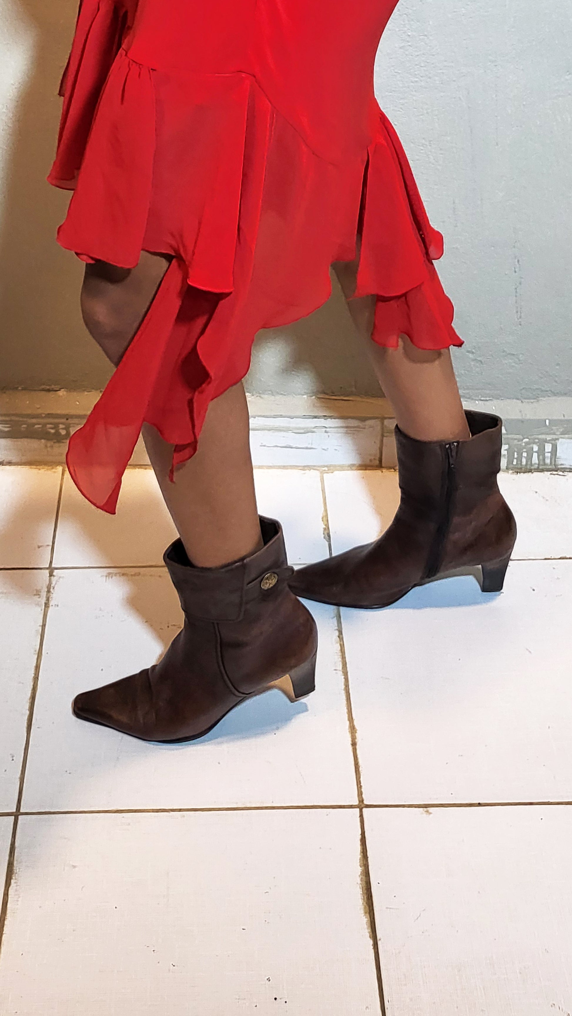 Chic, sleek, and irresistibly Parisian. These authentic vintage BATA ankle boots are crafted in coffee-brown genuine leather, featuring a pointed toe, mid-heel, and fold-over cuff detail with a brass-tone button. A timeless silhouette that instantly elevates any look—pair with dresses, denim, or tailored trousers for that effortless French-girl elegance.