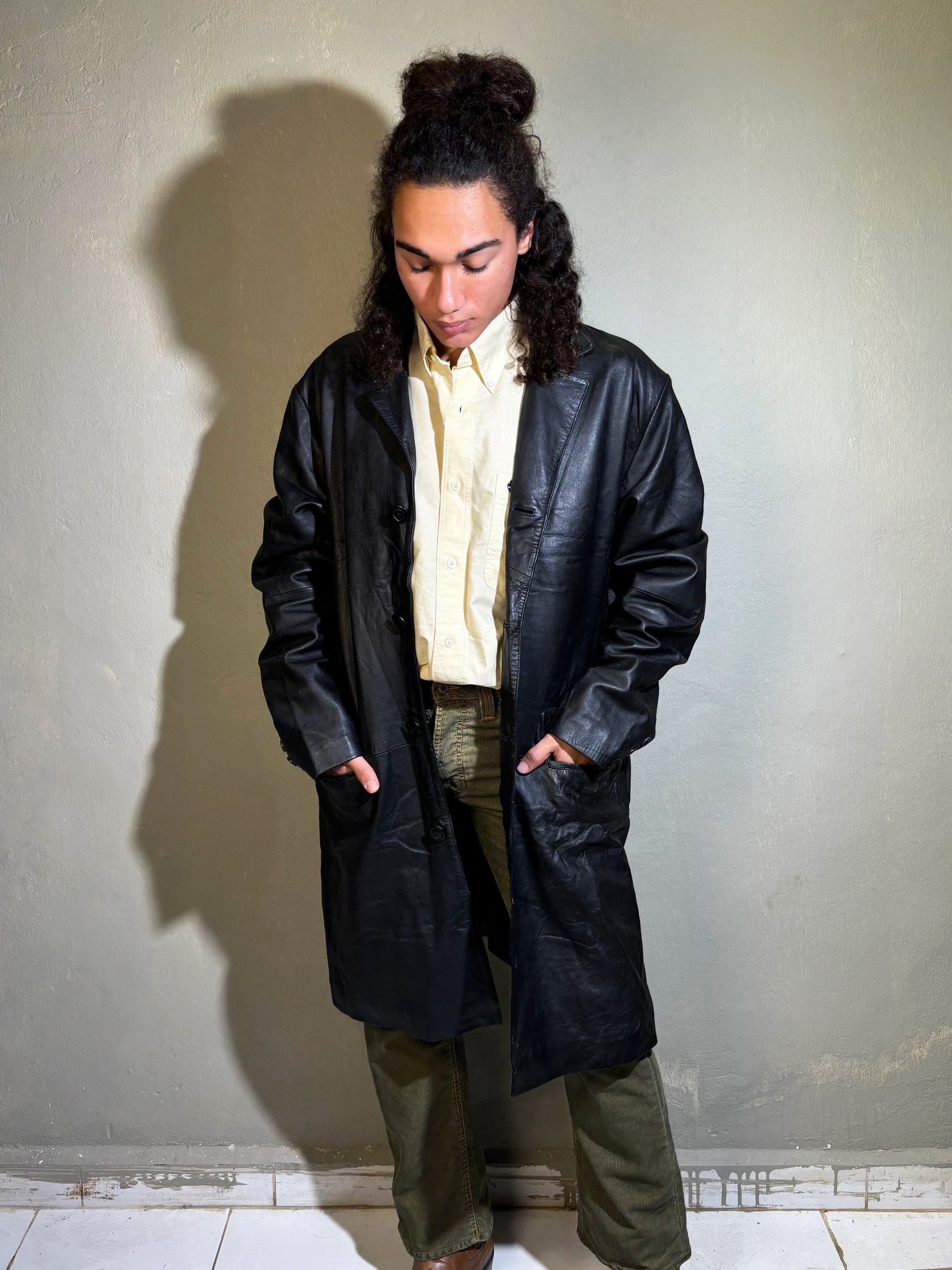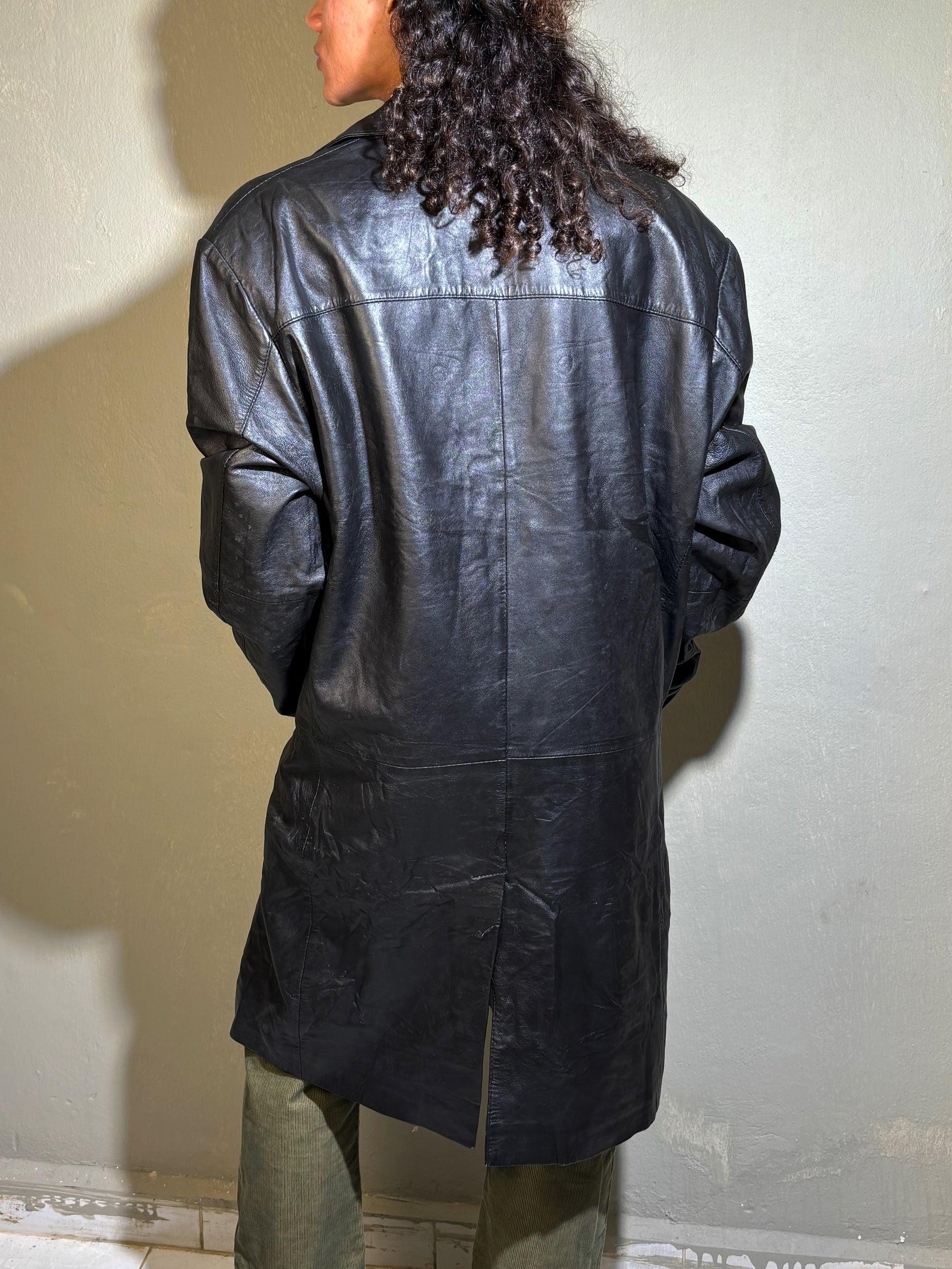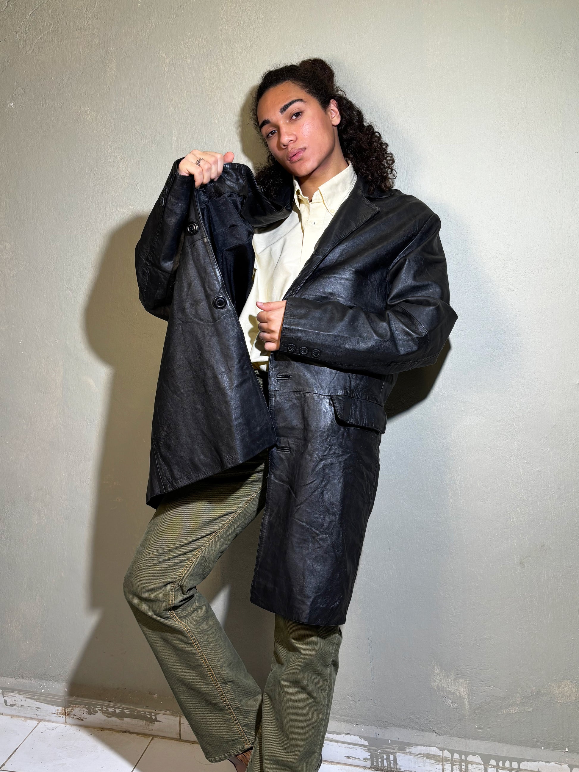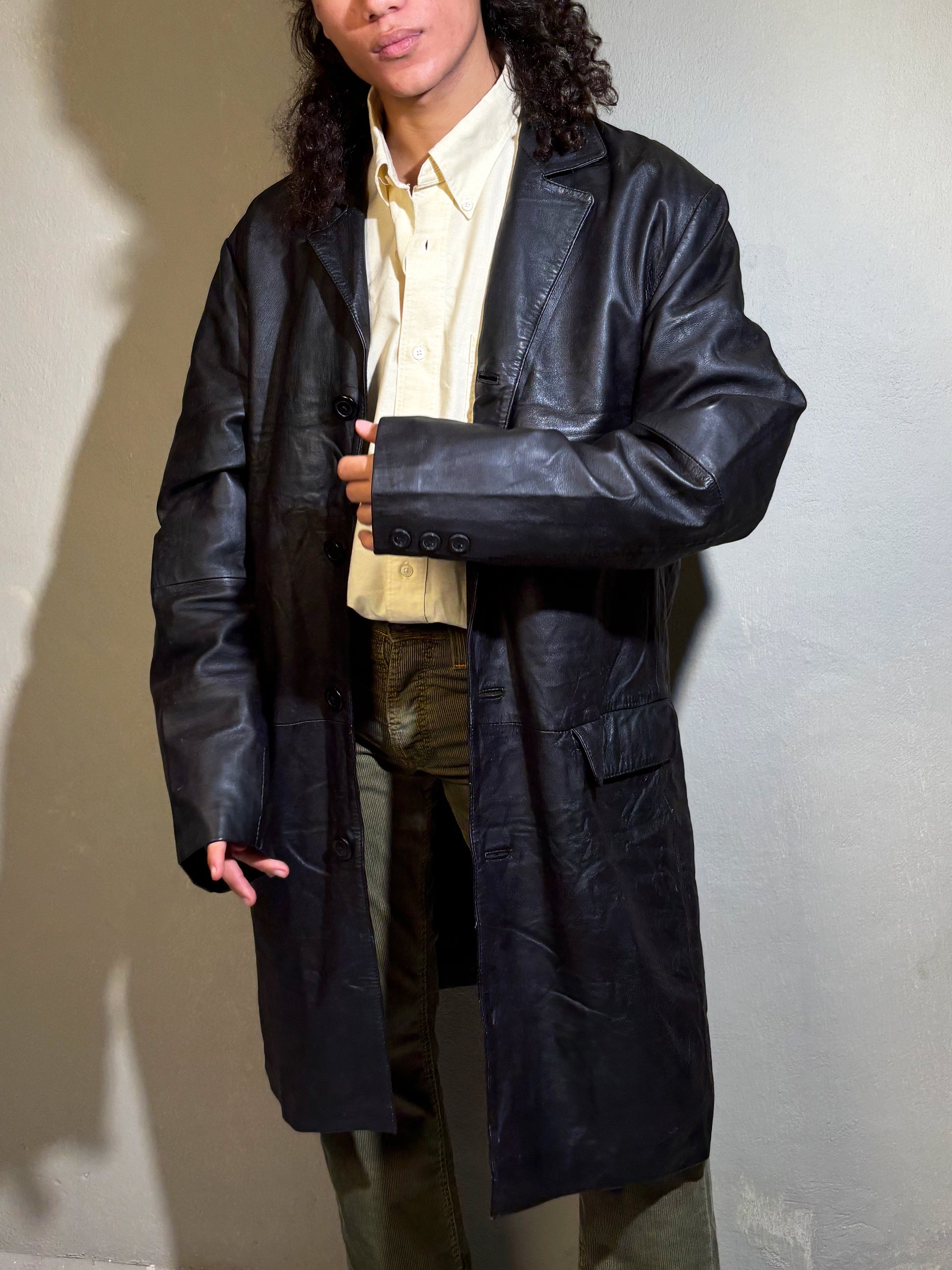 A sleek, elongated genuine-leather overcoat with a structured, masculine-coded silhouette. Features a clean button-front, sharp notch collar, and deep flap pockets that add attitude and practicality. The leather has a naturally worn, lived-in patina that gives it that real vintage character. A statement outerwear piece you throw over anything — shirts, knits, cargos — and instantly look elevated.