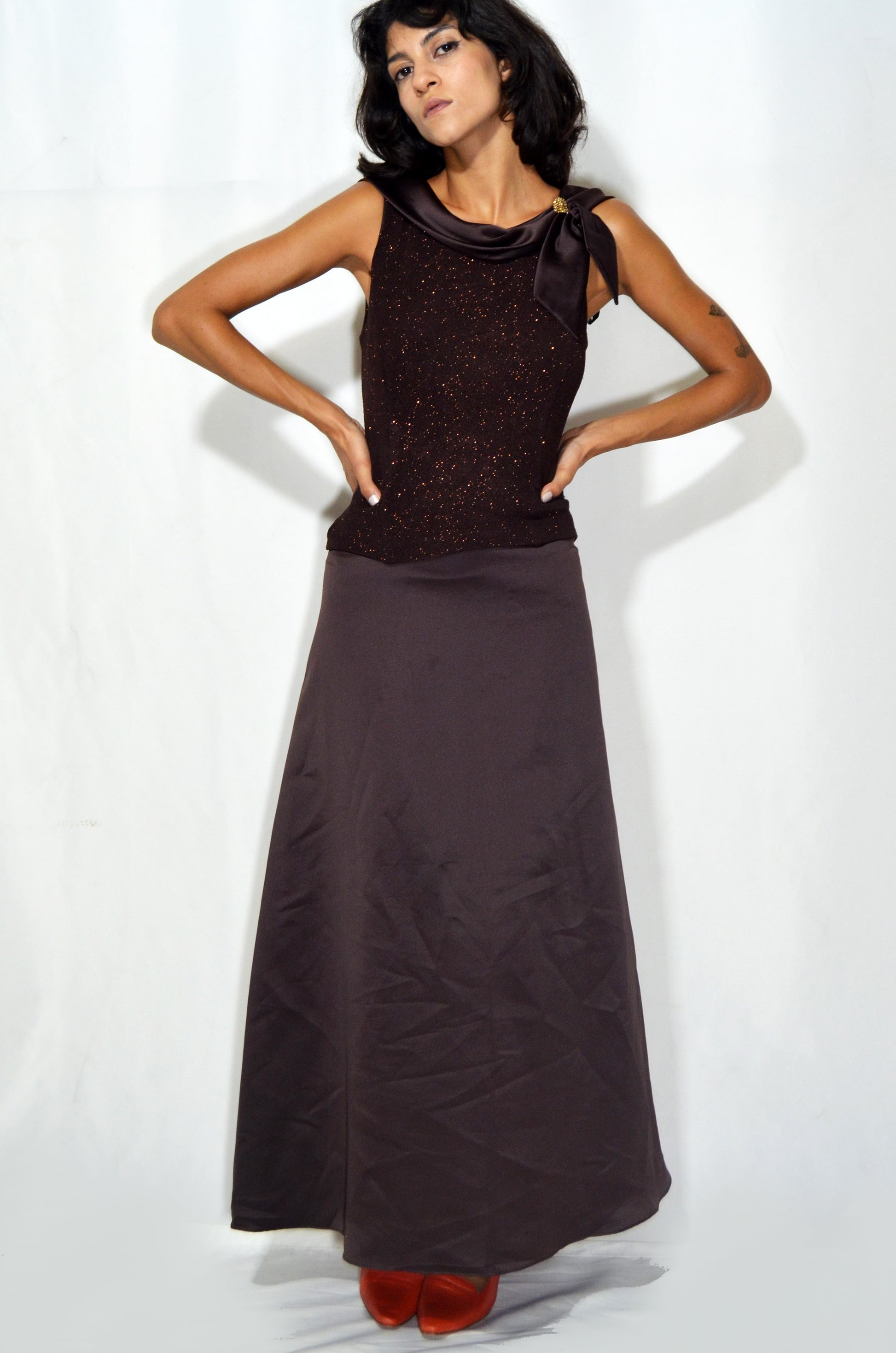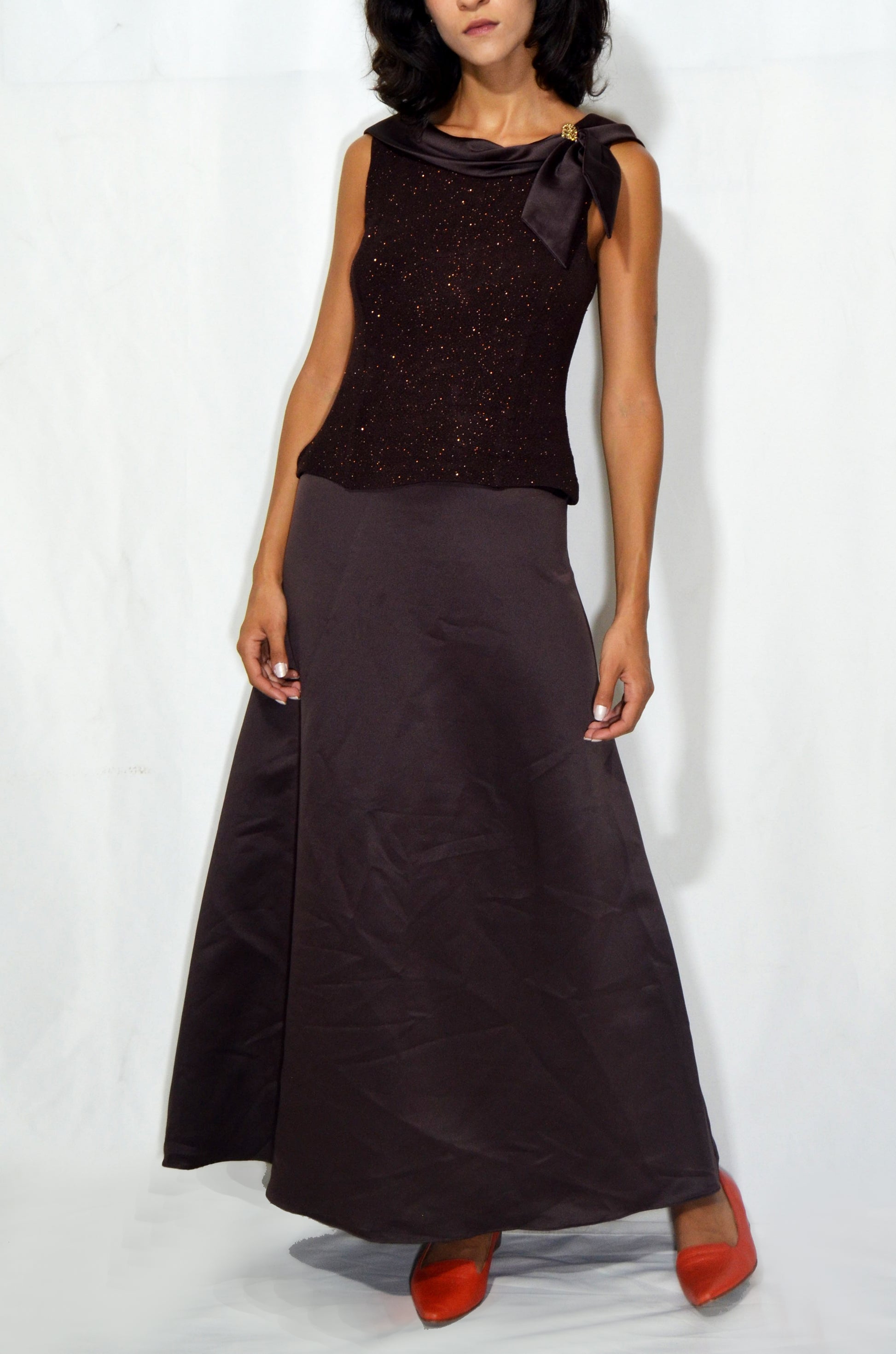 This vintage brown flared evening gown exudes timeless elegance with its luxurious silk fabric and subtle sparkles that catch the light beautifully. Crafted with exceptional quality, it offers a refined silhouette perfect for sophisticated occasions. A truly high-end piece that combines classic charm with a touch of glamour.