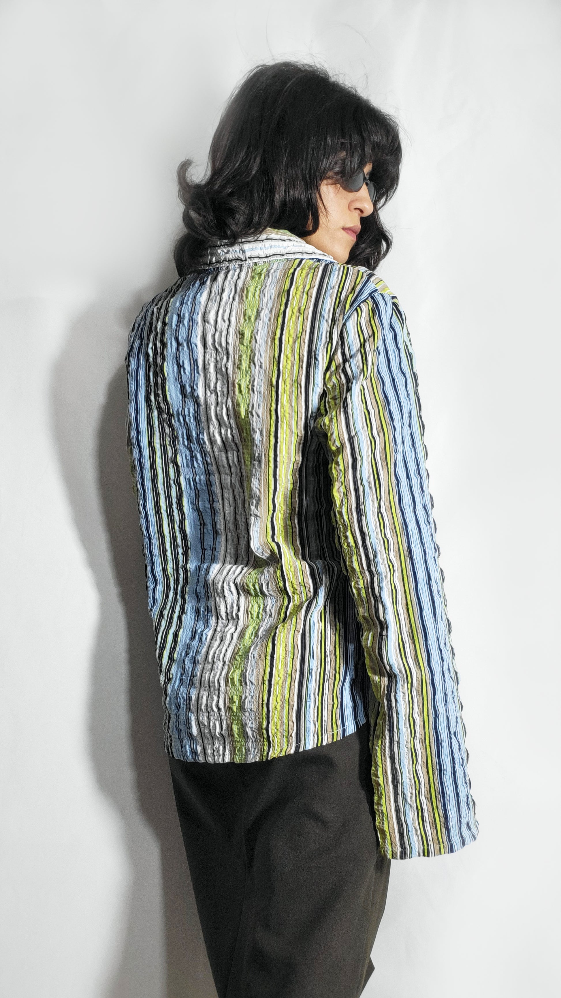 Vintage 90s button-up in textured crinkle fabric with vertical stripes in blue, lime, black, and white. Designed with a relaxed fit and slightly flared sleeves, it’s a bold yet easygoing piece that captures the laid-back spirit of 90s style.