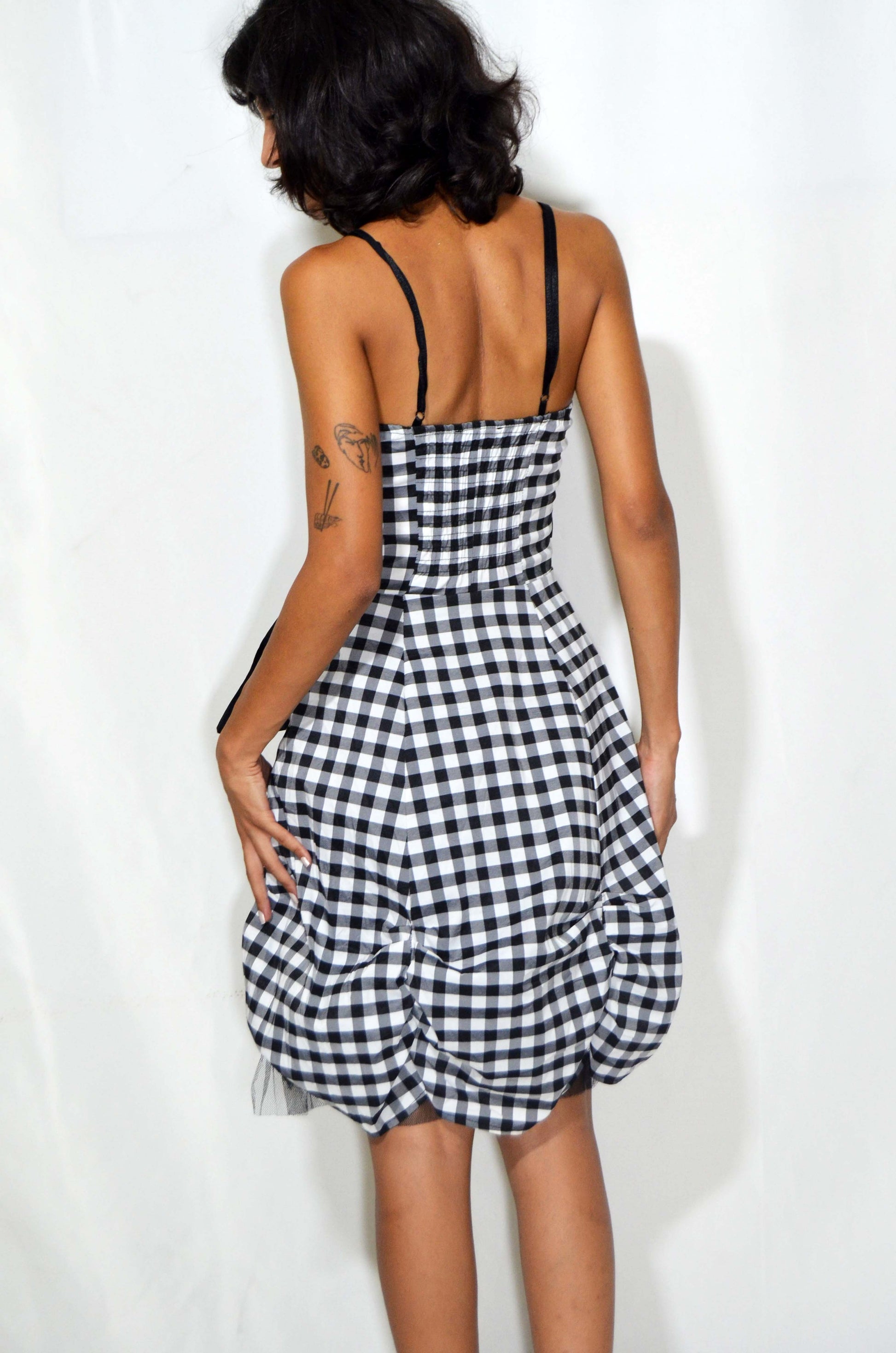 This vintage-inspired midi dress features a classic gingham check pattern and delicate spaghetti straps, offering a timeless silhouette. Its puffy sleeves add a touch of romantic volume, while the oversized front bow creates an elegant focal point. Perfect for sophisticated occasions, this dress combines nostalgic charm with refined style.