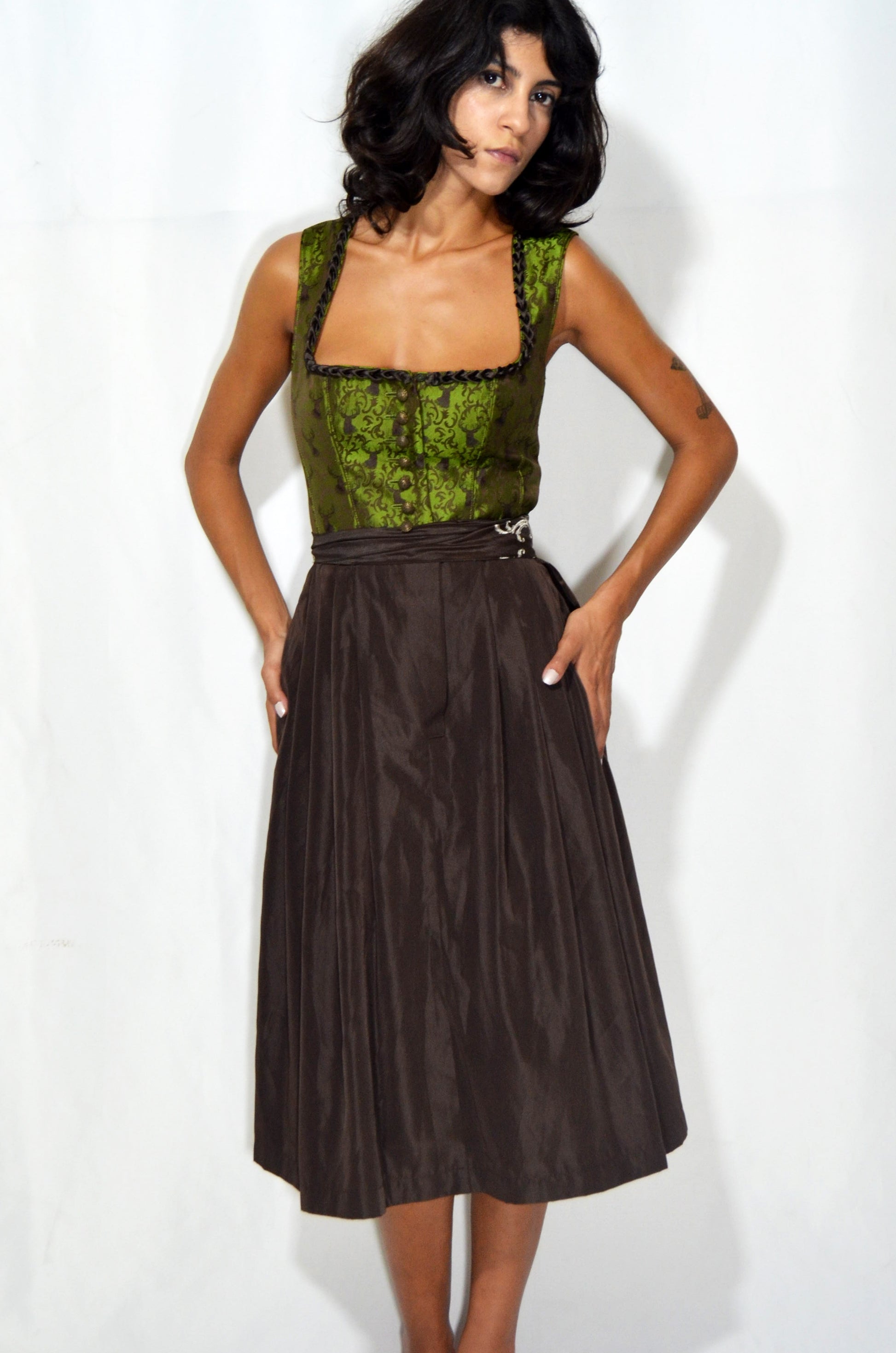Embrace timeless elegance with this vintage-inspired green and brown dirndl. Featuring a flattering midi length and a gracefully flared skirt, it offers both comfort and style. The squared neckline adds a refined touch, while the classic apron completes the traditional look with sophistication. Perfect for those who appreciate heritage fashion with a modern sensibility.