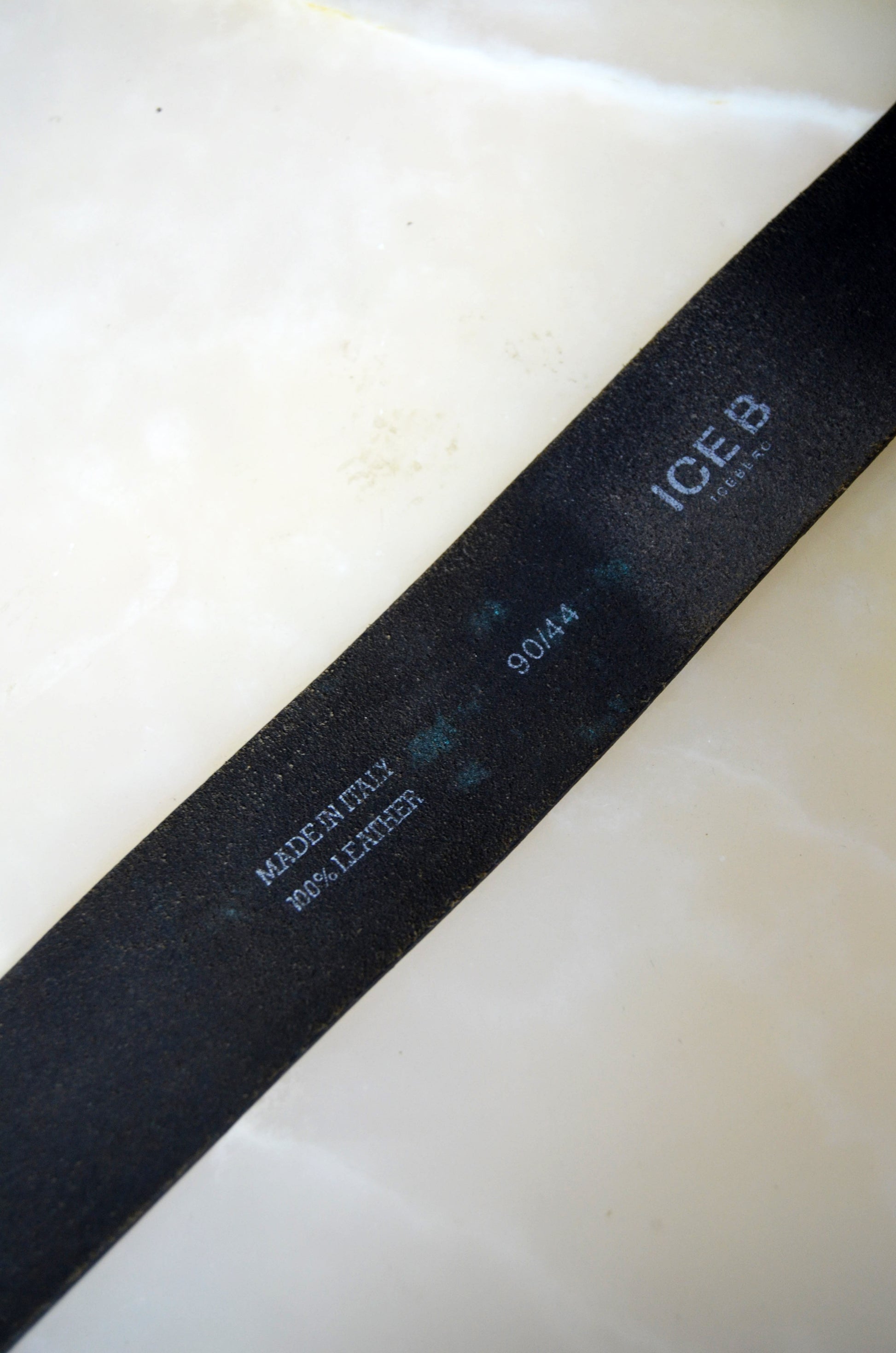 Black leather strap with an oversized enamel + crystal oval buckle. Iconic ICE B logo, Betty Boop motif. Made in Italy (marked 90/44). 100 Cm.
