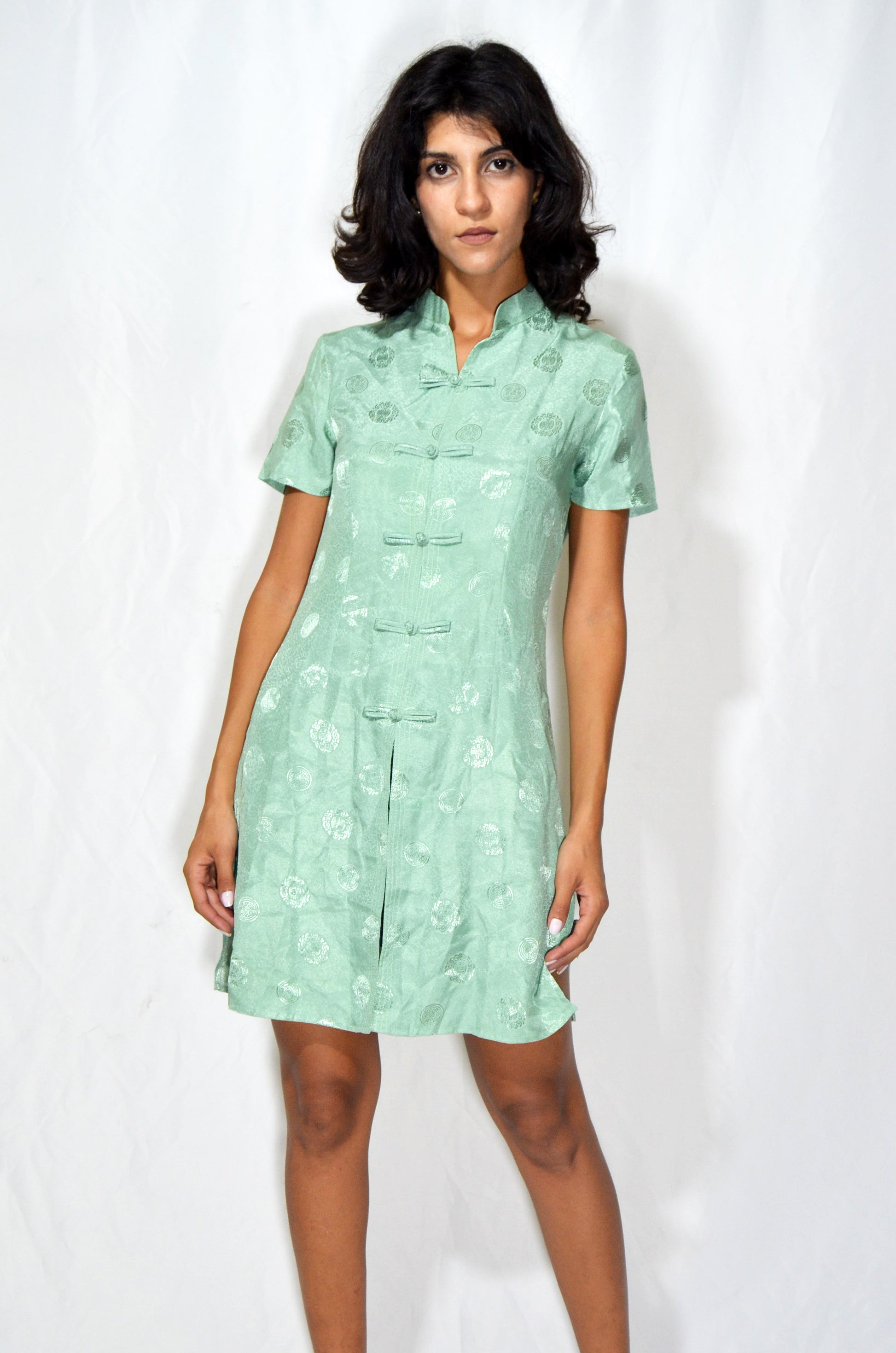Authentic vintage mint green tunic featuring a mandarin collar, short sleeves, and traditional knot button closures down the front. Crafted from brocade fabric with subtle floral motifs, this knee-length piece includes side slits for ease of movement, perfect to style over pants or skirts.