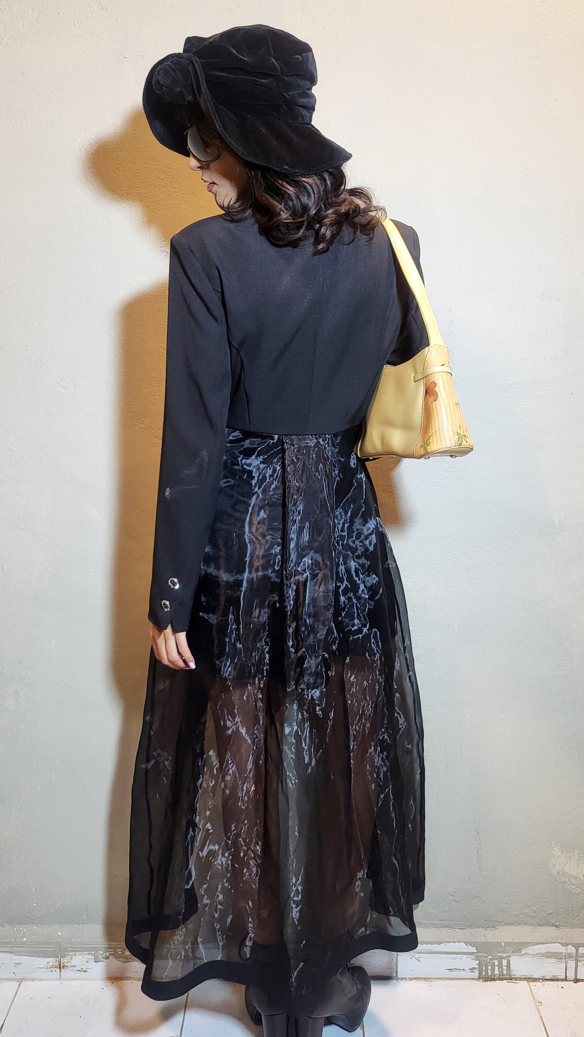 A unique vintage dress featuring a structured tailored top paired with a sheer, flowing high-low skirt. The marbled, textured front panel adds depth and contrast, creating an elegant and truly one-of-a-kind silhouette.