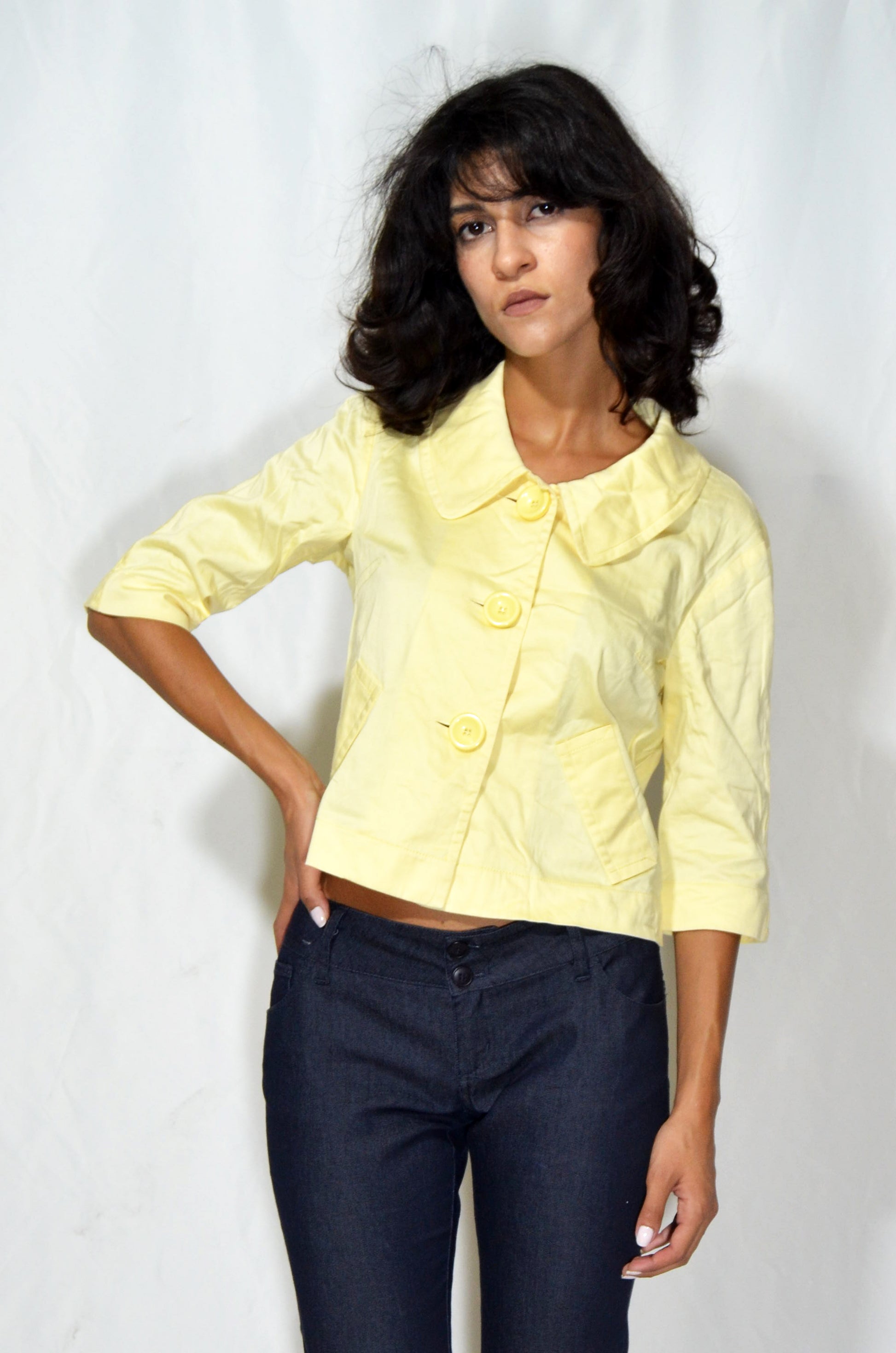 Bright yellow cropped jacket featuring 3/4 sleeves, a wide rounded collar, and oversized buttons down the front. Includes two front pockets and a slightly boxy silhouette.